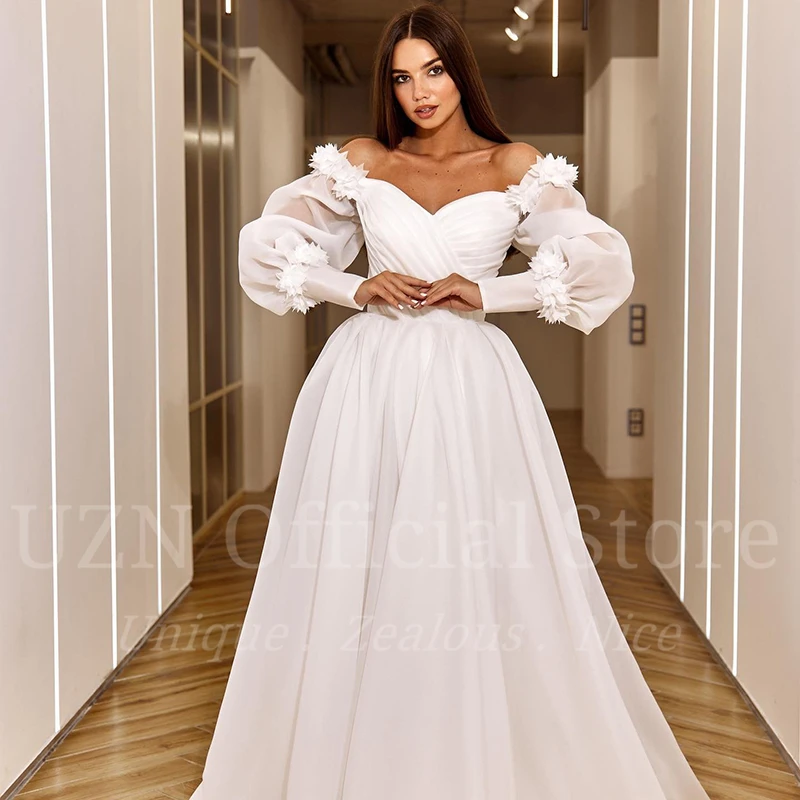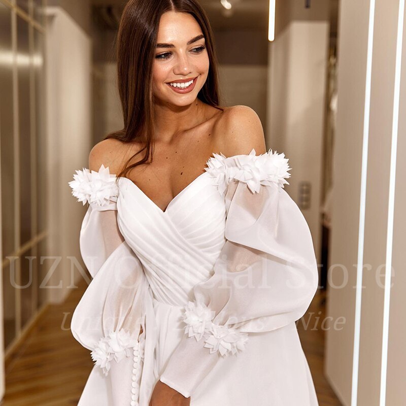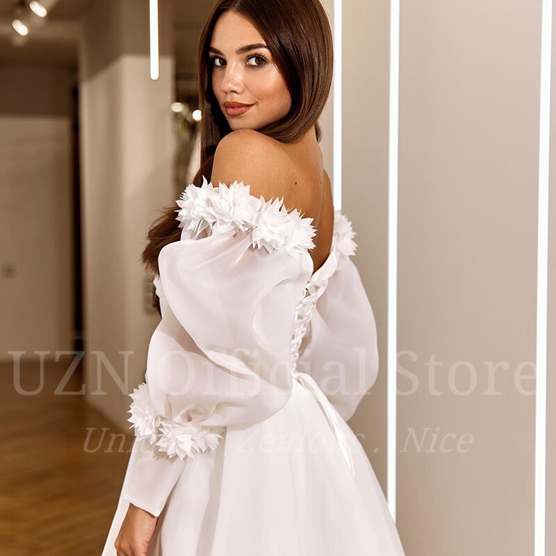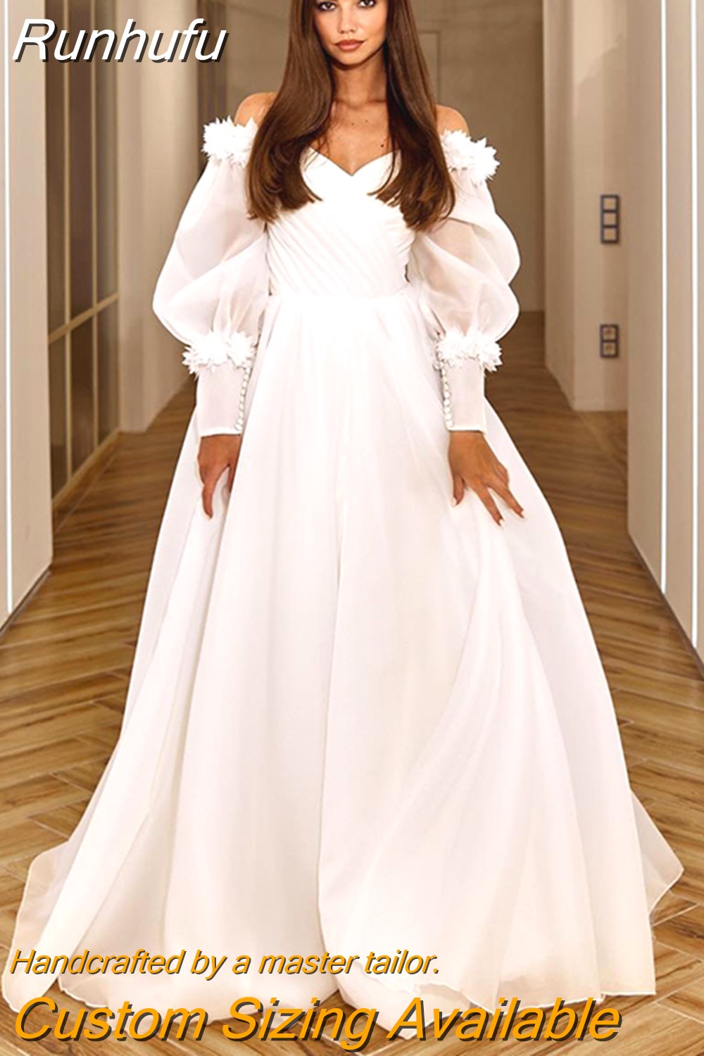 Runhufu Elegant A-Line Wedding Dresses White Puff Sleeve Appliques Bridal Gowns Boho Beach Tulle Evening Wedding Gowns Custom Size