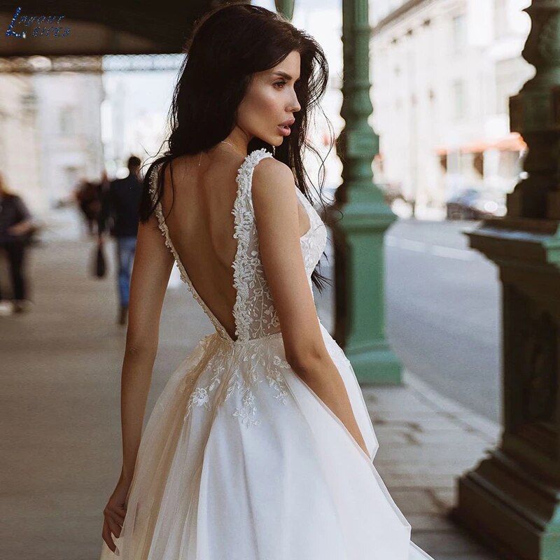 Runhufu Elegant Long V-Neck Wedding Gowns Sleeveless Appliques Flowy Tulle Backless Bridal Dresses Sexy Wedding Dress For Women