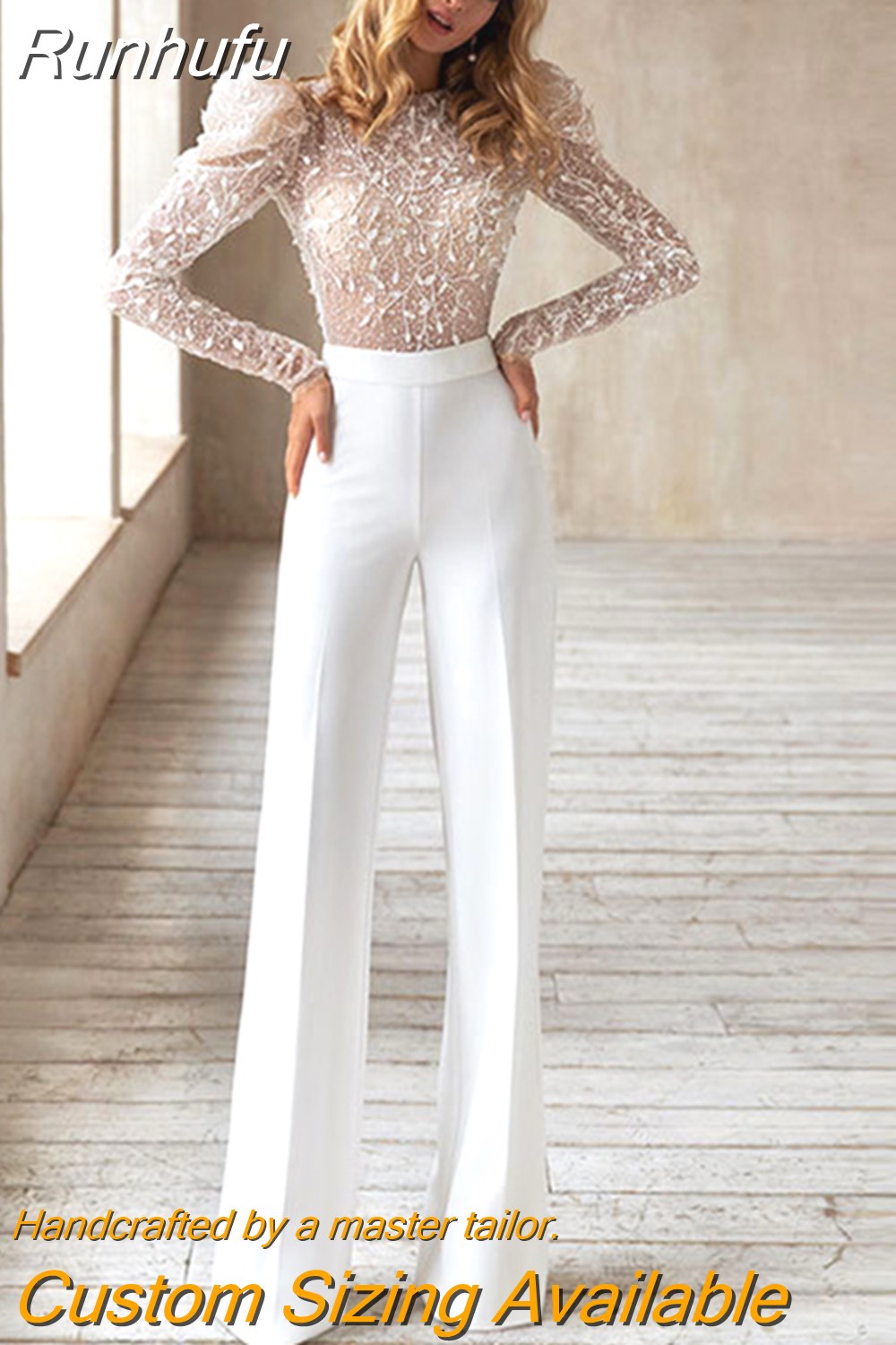 Runhufu Elegant Wedding Jumpsuit Sparkle Luxury Long Sleeves 3D Flowers Beadings Open Back Pants Suits For Bride Vestido De Novia