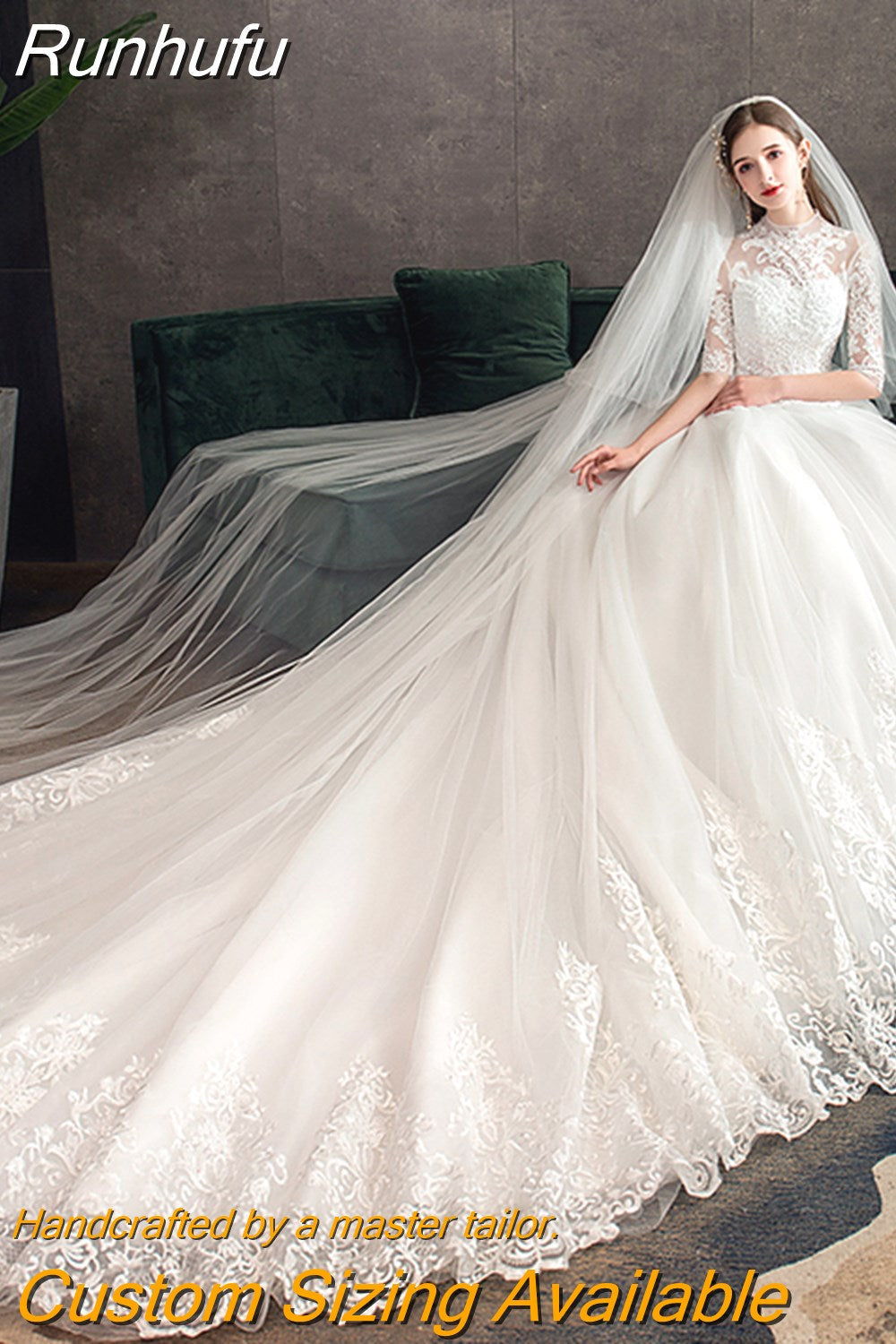 Runhufu Embroidery Wedding Dress With Big Train 2023 High Neck Half Sleeve Wedding Gown Vintage Bridal Gown