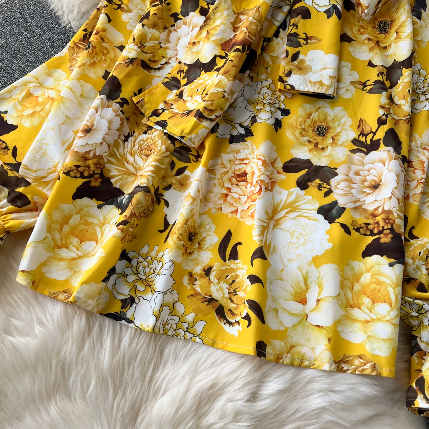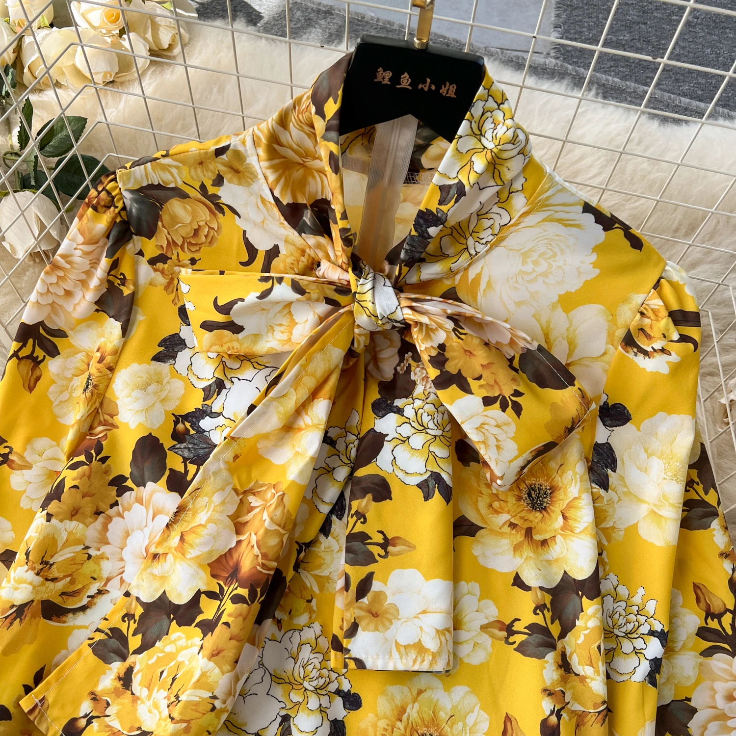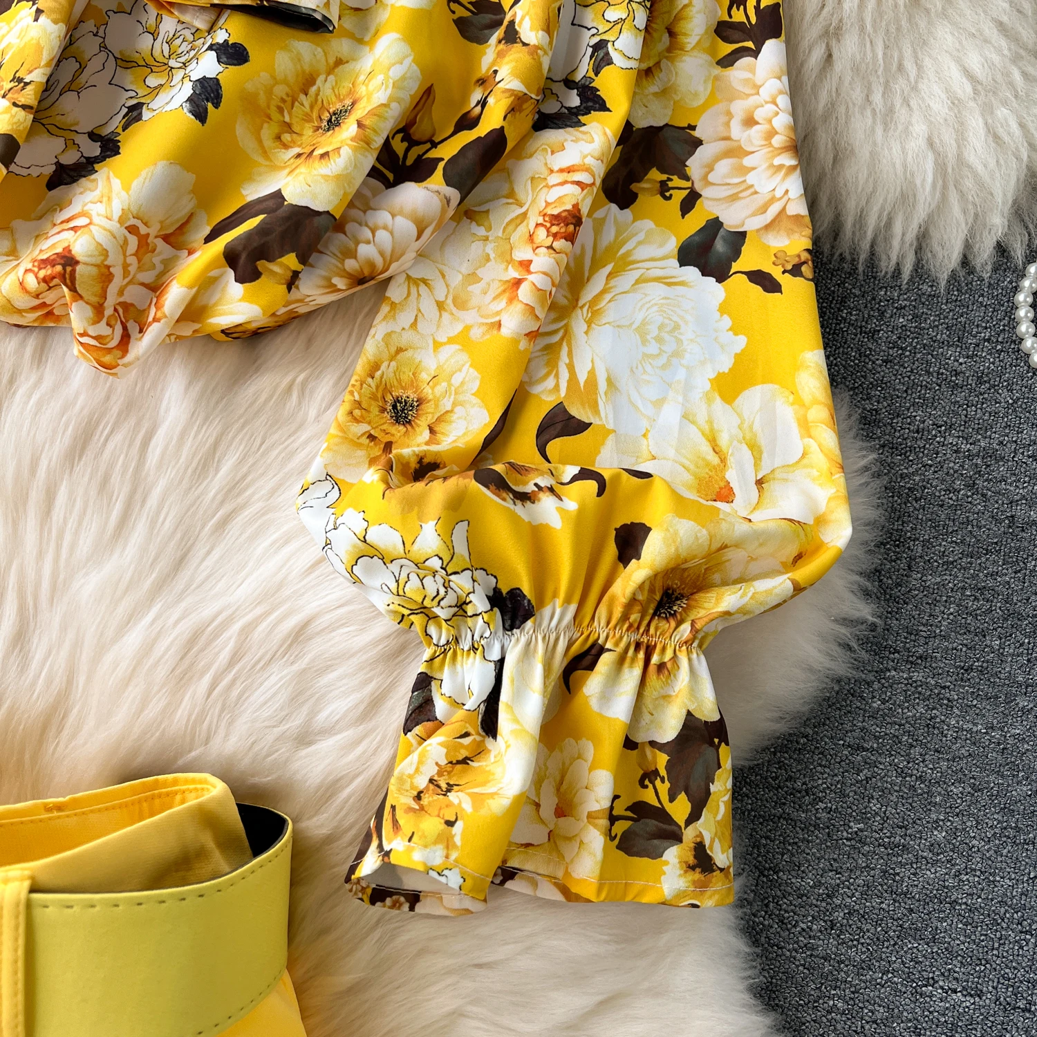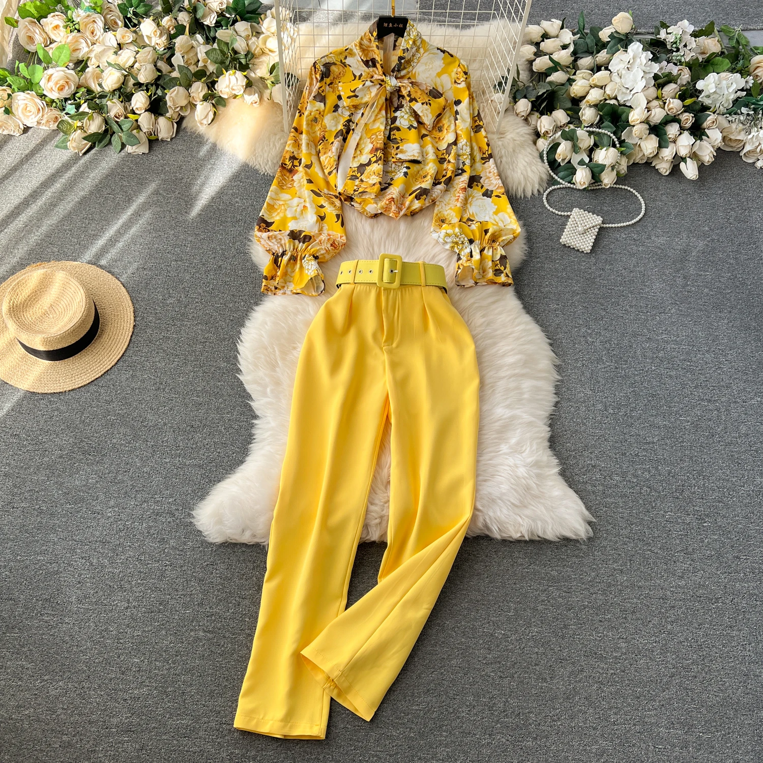 Runhufu Fashion Printed Suits Women Bow Collar Lantern Sleeve Floral Blouse+Belt Solid Long Pants Streetwear Senior Sets