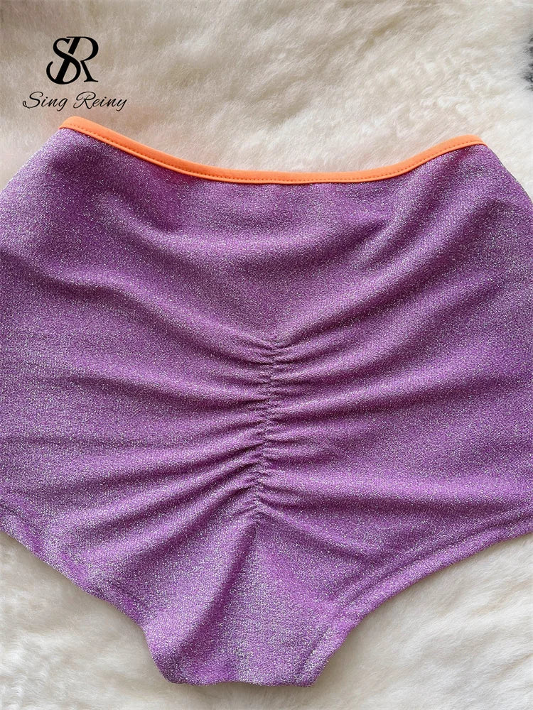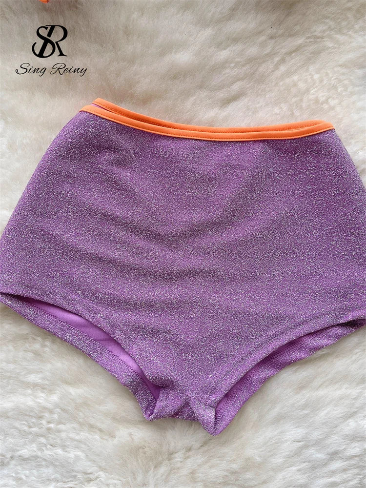 Runhufu Fashion Vacation Shiny Swimsuits Women Strap Backless Camisole+Elastic Waist Shorts Sexy Bikini Beach Two Pieces Suits