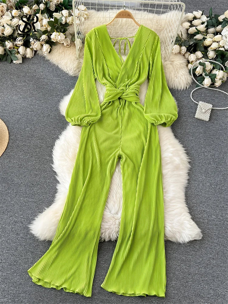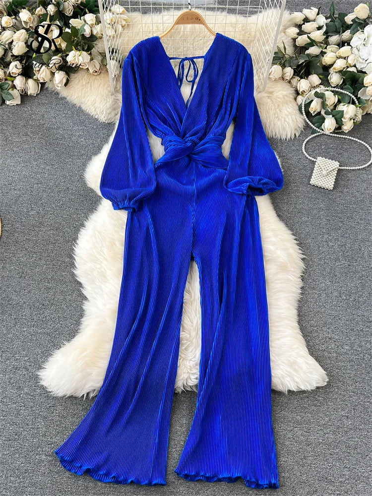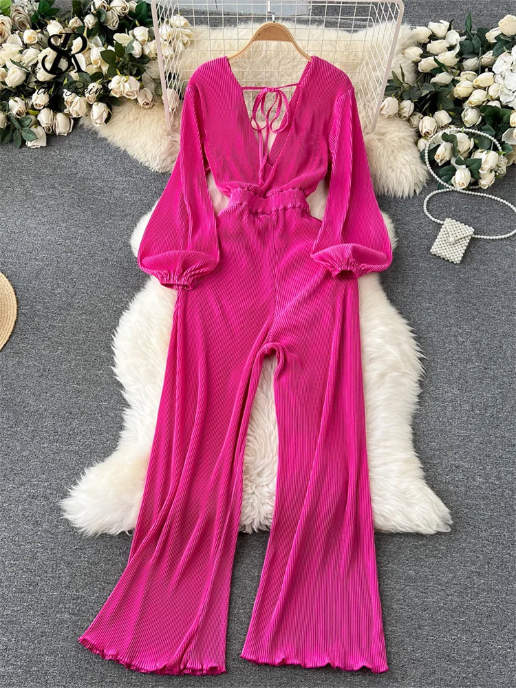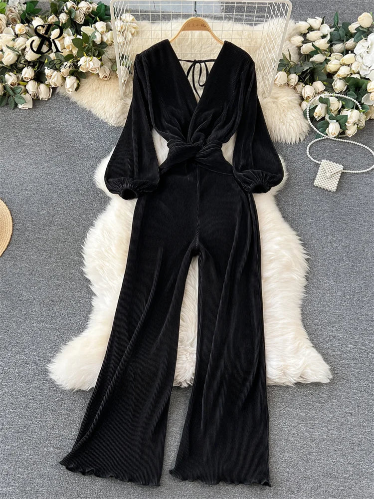 Runhufu France Chic Women Jumpsuits Deep V Neck Long Sleeves Backless Kink Design Solid Autumn Fashion Senior Loose Rompers