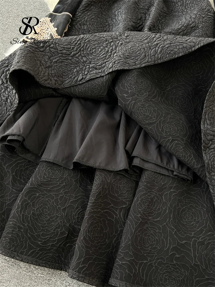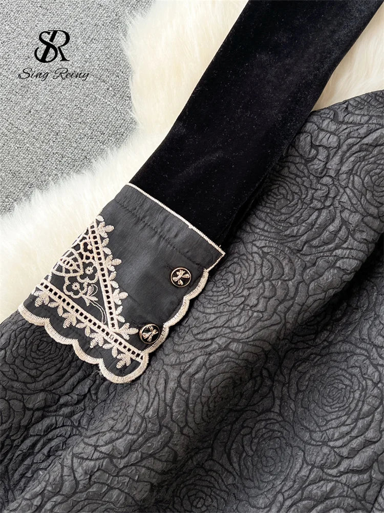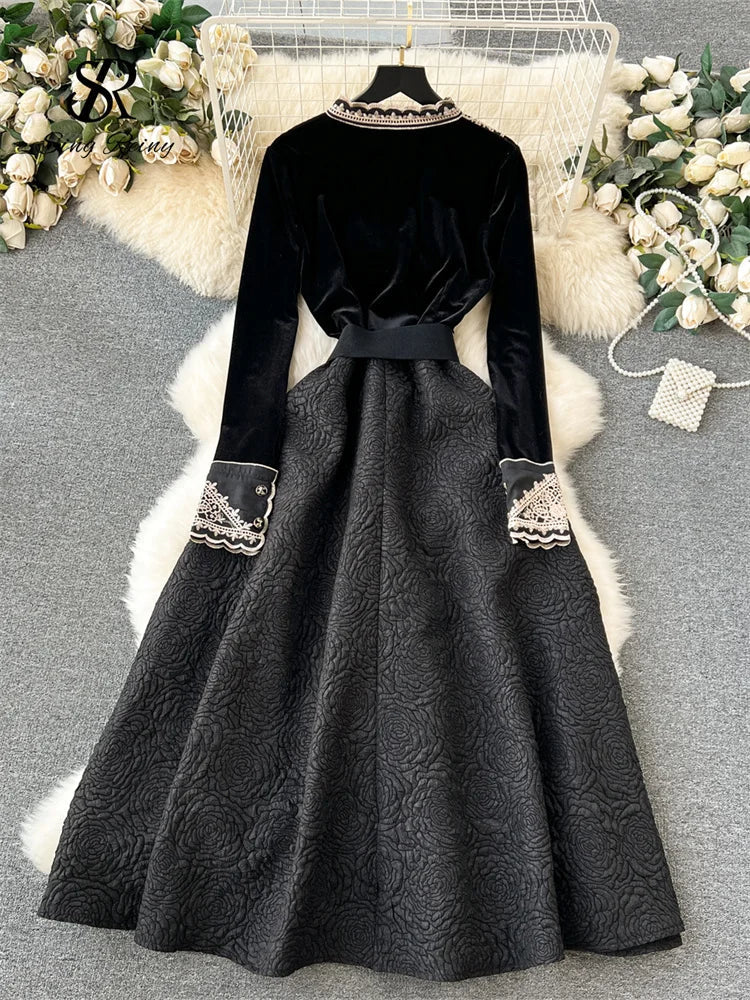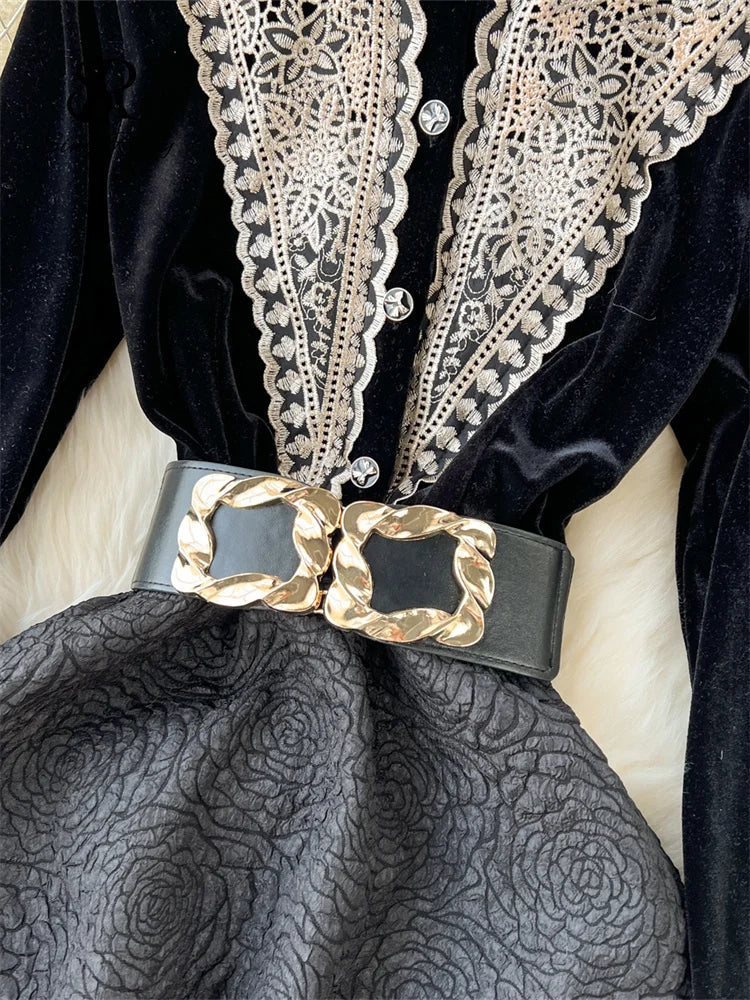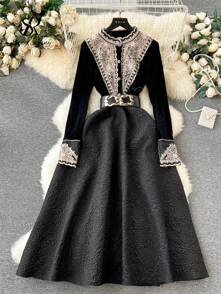 Runhufu French Retro Dress Fashion High Quality Embroidery Velvet Long Sleeves Women Elegant Belt Design A Line Court Dress