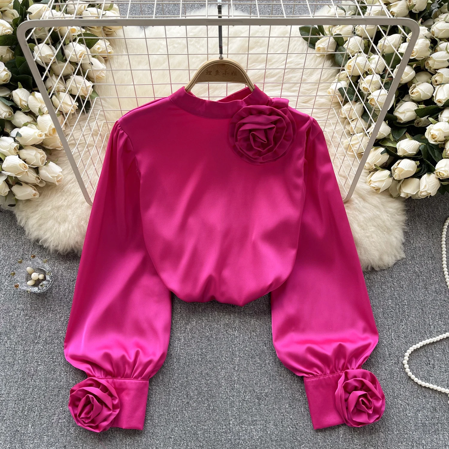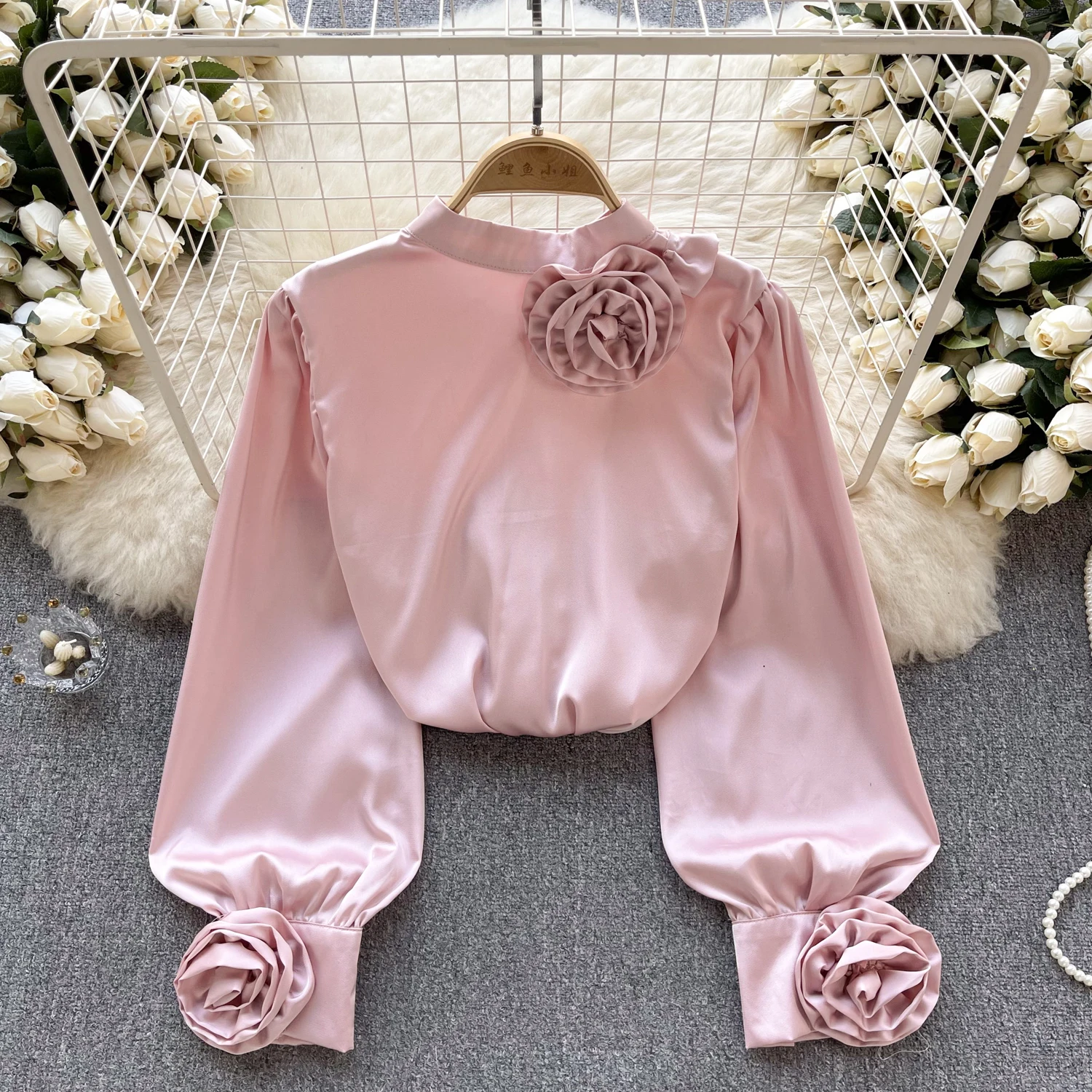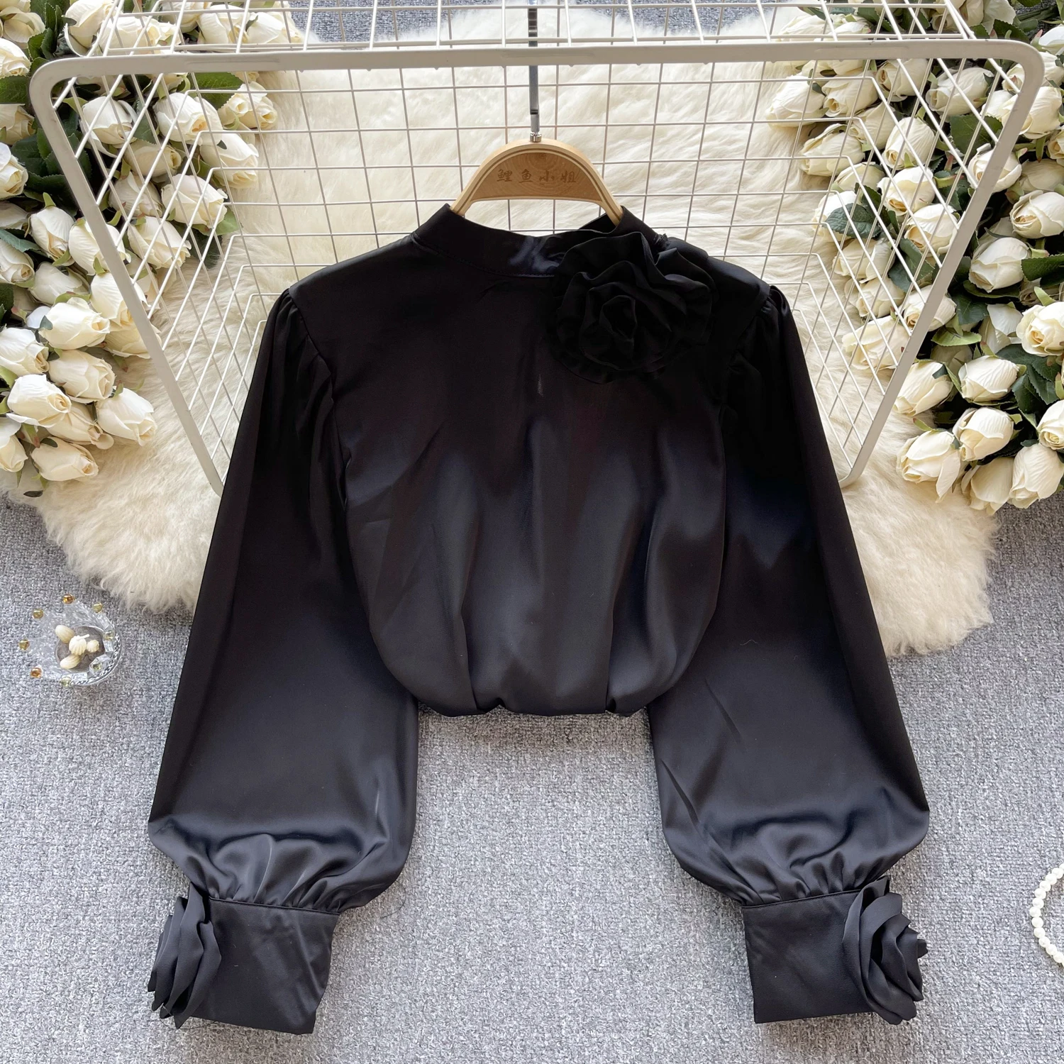 Runhufu French Senior Satin Loose Shirt Women Elegant Long Sleeve 3D Flower Spring Top Fashion Single Breasted Solid OL Blouse