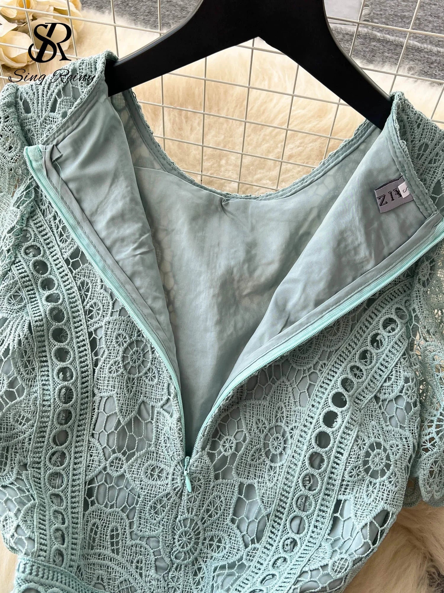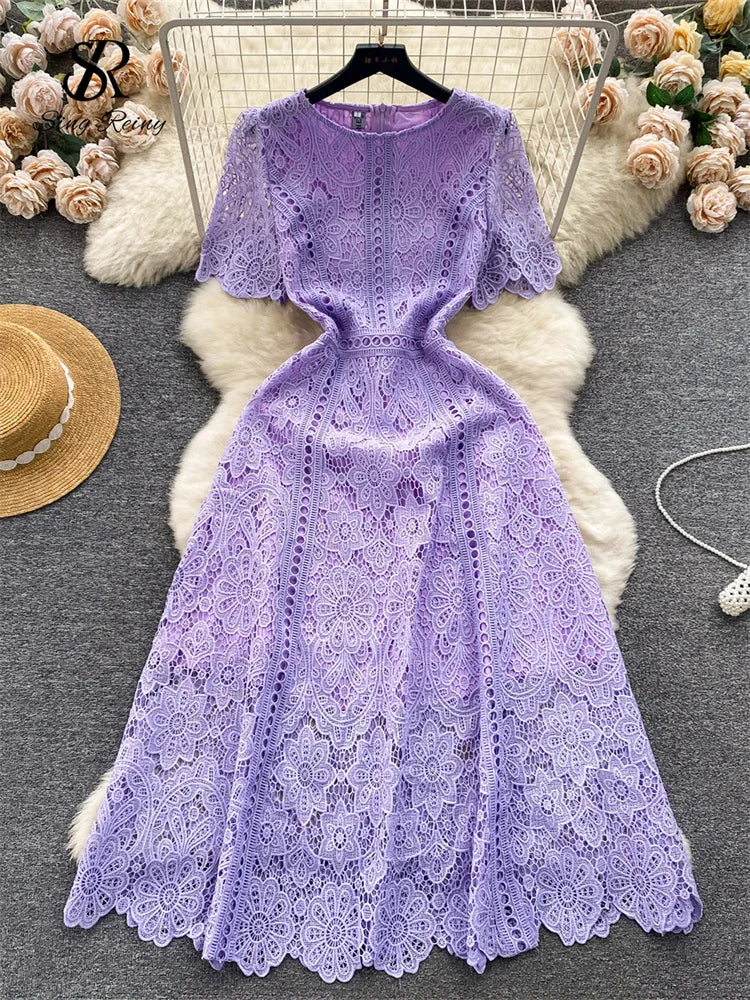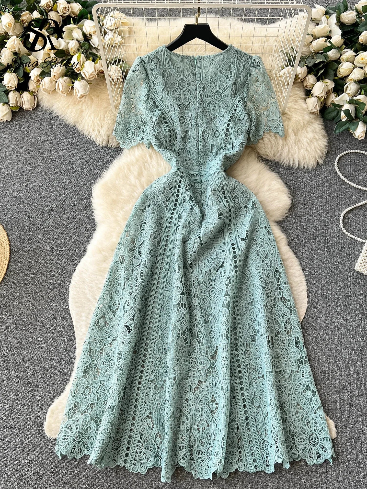 Runhufu French Vintage Casual Lace Dress O Neck Butterfly Sleeve Zipper Hook Flower Hollow Fashion Slim Embroidery Long Dress