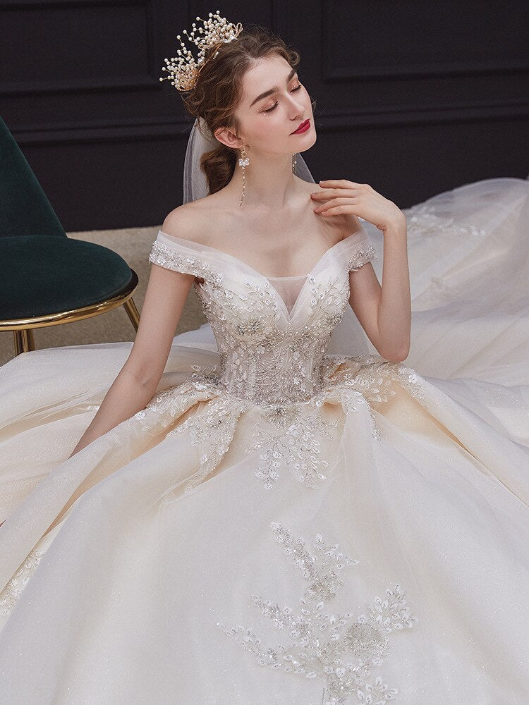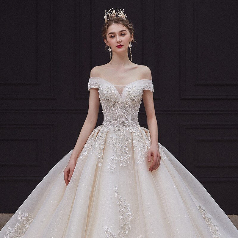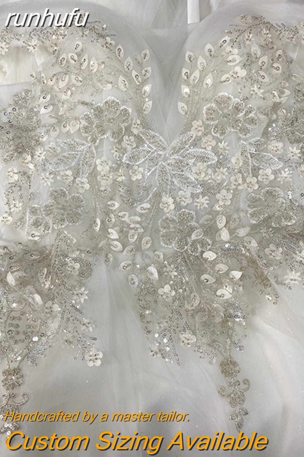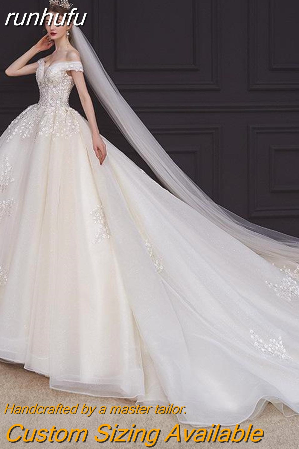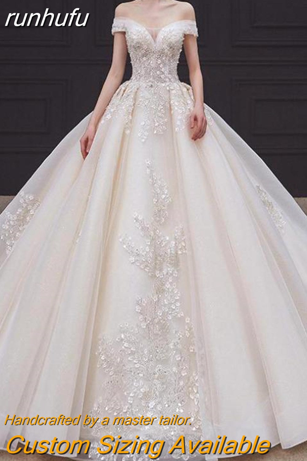 runhufu Handmade Boat Neck Wedding Dress With Train Lace Flower Bridal Dress Elegant Off The Shoulder Ball Gown Robe De Mariee