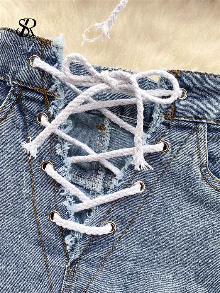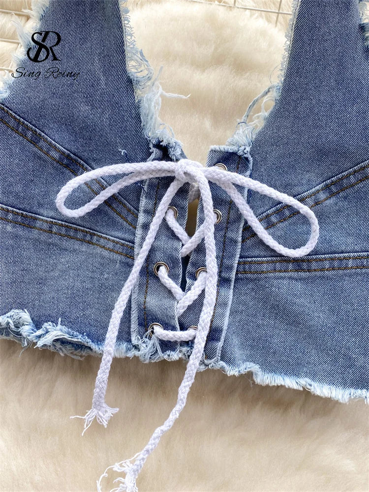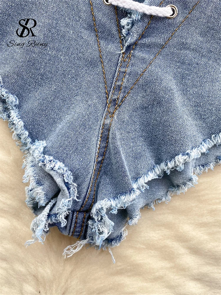 Runhufu High Quality Denim Sets Fashion Sleeveless Backless Halter Short Tank+Cross Lace up Sensual Shorts Women Sexy Suits