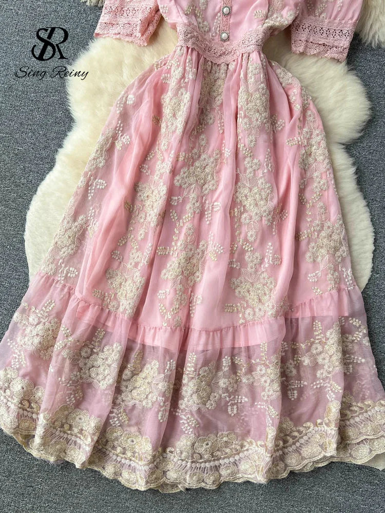 Runhufu High Quality Lace Embroidery Long Dress Women Short Sleeves Mesh A Line Sundress 2024 French Vintage Floral Midi Dress