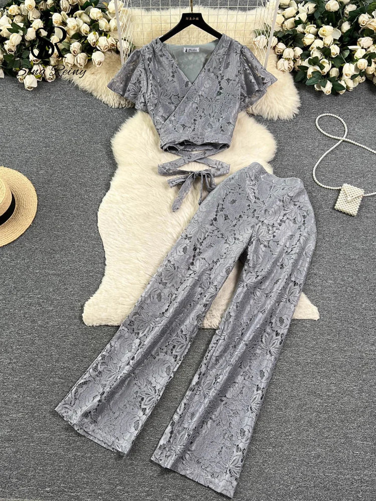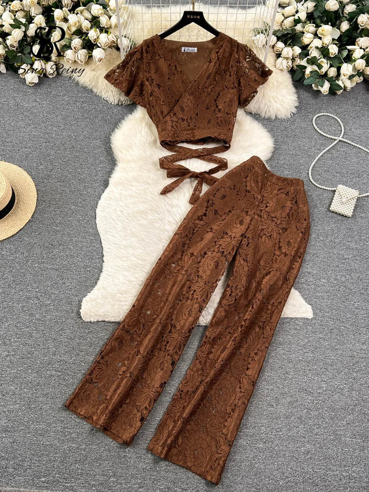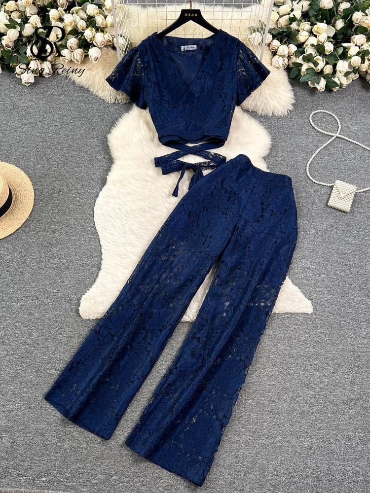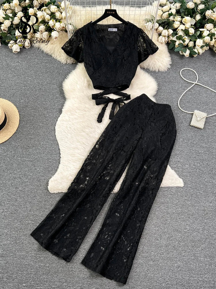 Runhufu High Street Women Lace Slim Two Pieces Suits Summer Lace Up Short Top+Wide Legs Long Pants Set Retro Lace Floral Sets
