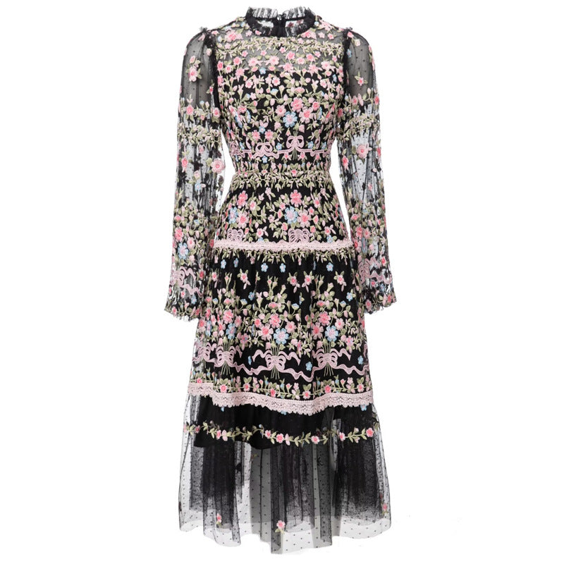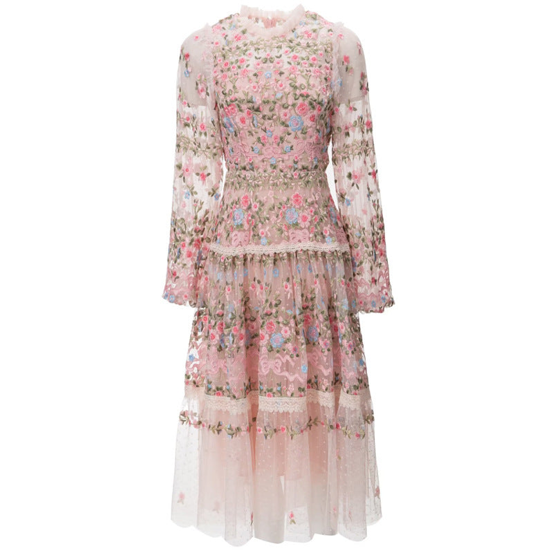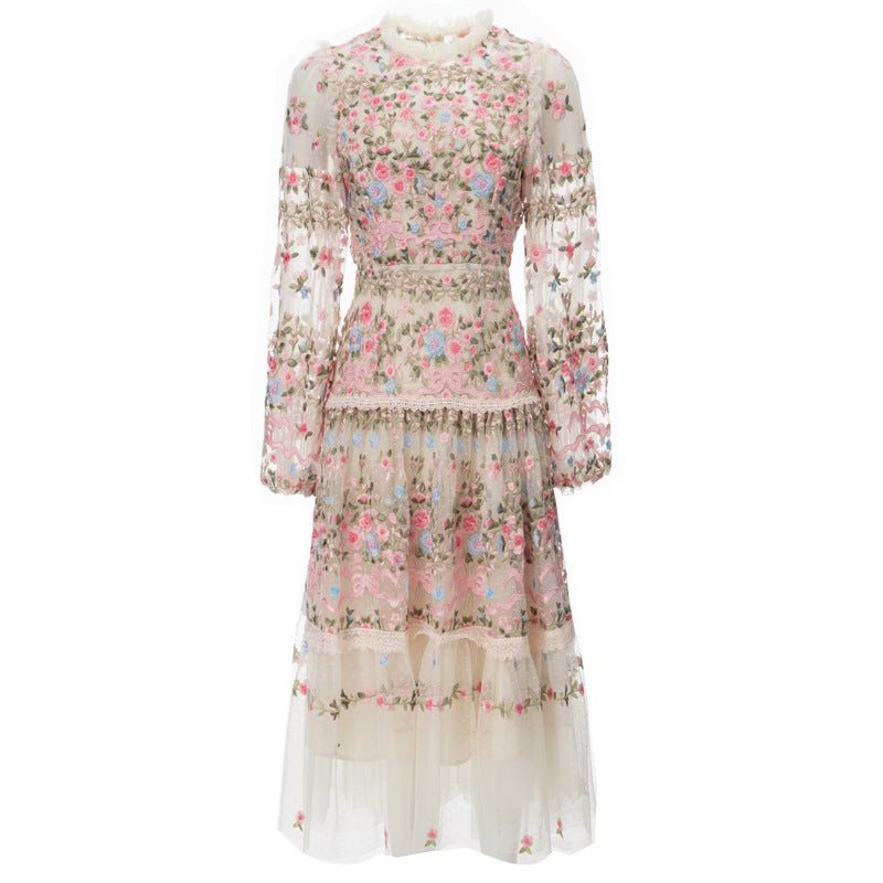 runhufu Industry Embroidery Lantern Long Sleeve Net Princess Wind Pink Dress Dress Autumn And Winter Women's New 2025