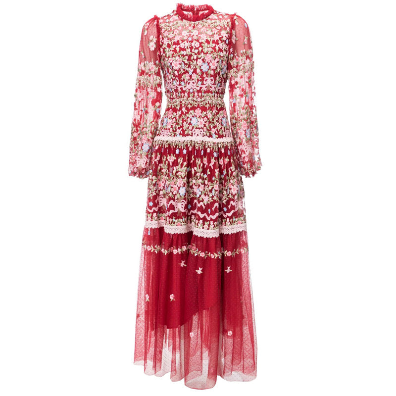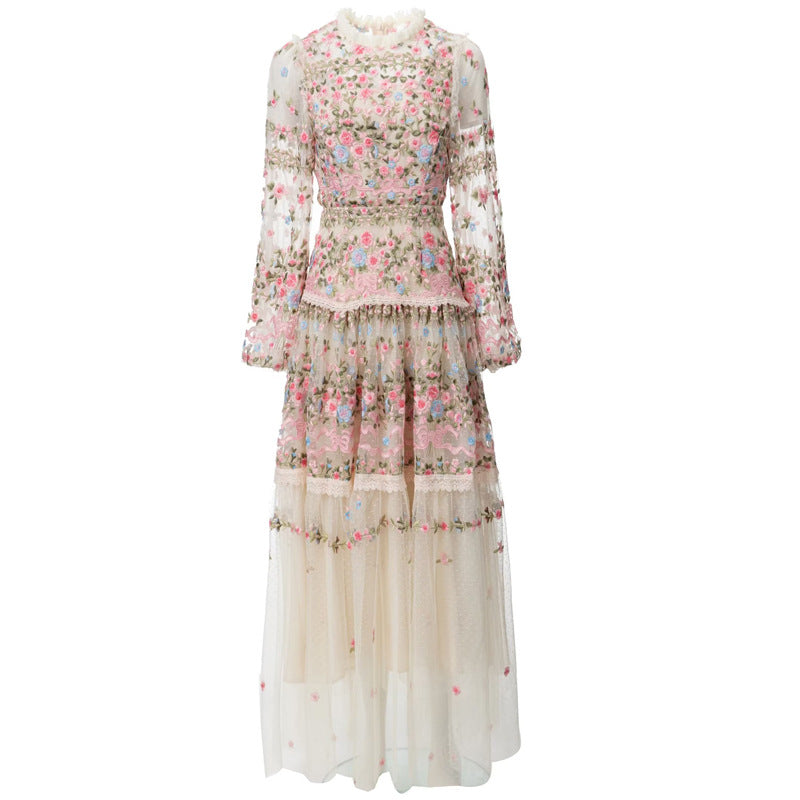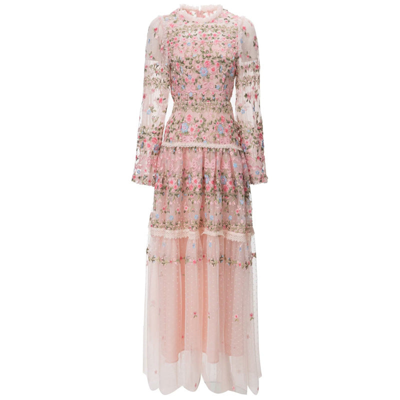 runhufu Industry Embroidery Lantern Sleeve Princess Powder Long Dress Dresses Autumn And Winter Women's New 2024