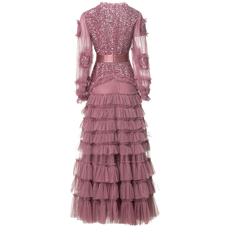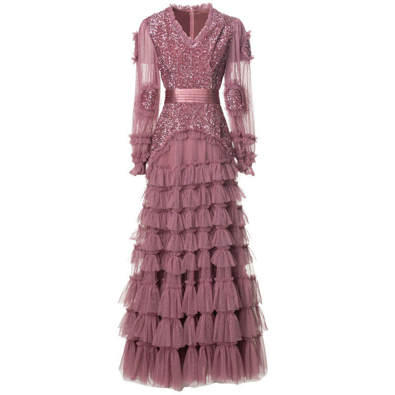 runhufu Industry Glide Sexy V-Neck Lotus Side Fluffy Long Dress Dress Dress Stand Women's Spring And Summer 2025