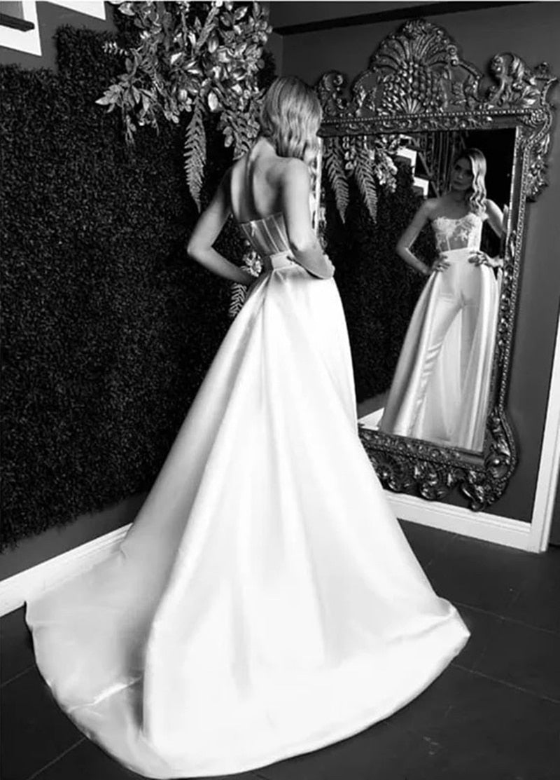 Runhufu Jumpsuit Wedding Dresses With Detachable Train 2023 A-Line Backless Lace Appliques Bridal Gown Pants Satin Sleeveless