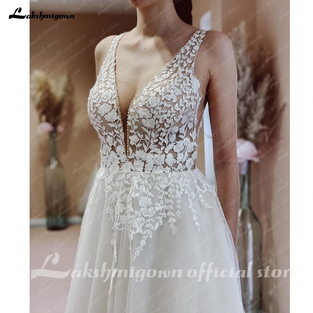 runhufu Lace Appliques Bohemian Wedding Dress for woman vestido blanco Beach Bridal Gowns V Neck party dresses