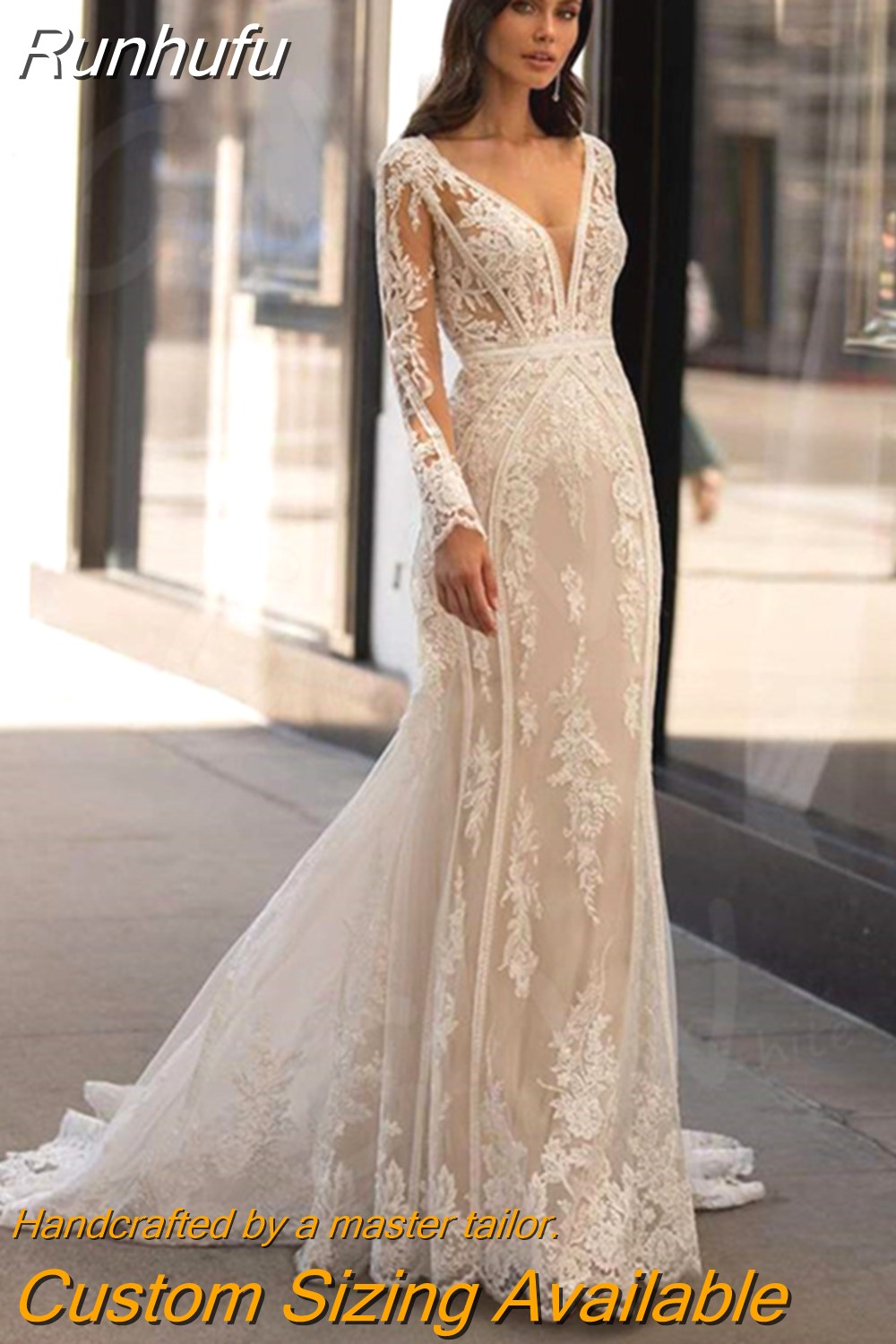 Runhufu Lace Mermaid Wedding Dress Long Sleeve V-Neck Sexy Illusion Back Bridal Gown Sexy Deep V Neck Vestidos De Novia Modernos