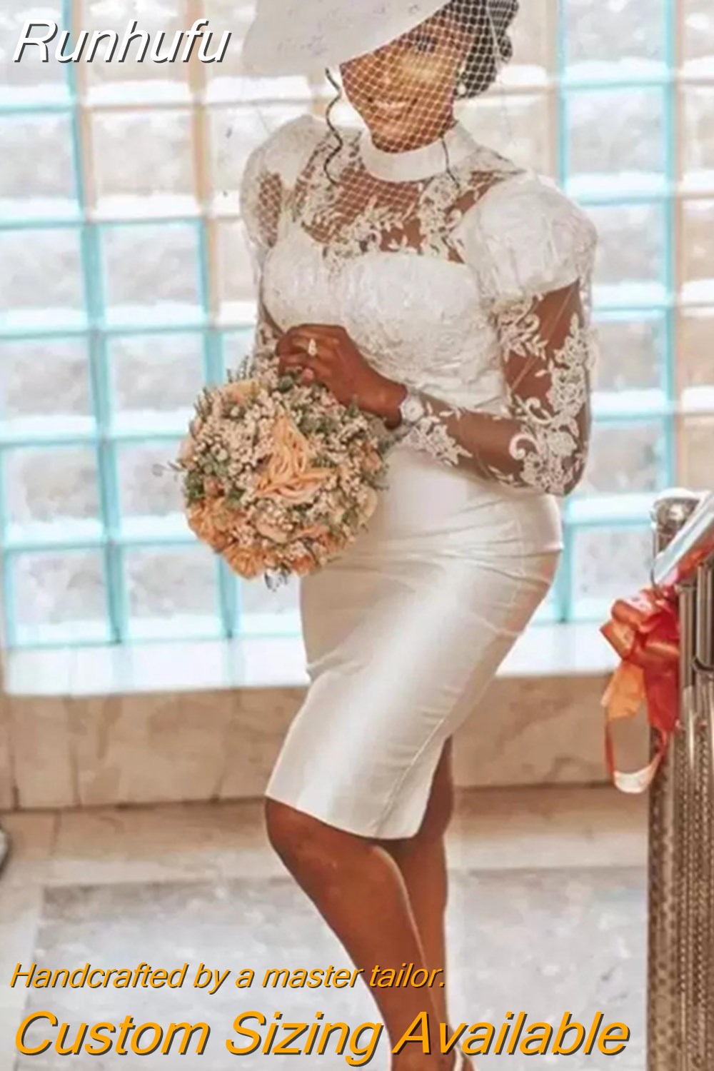 Runhufu Length Straight Wedding Dress Long Sleeves White Satin Bridal Reception Gowns Lace Applique High Neck Short Vestido