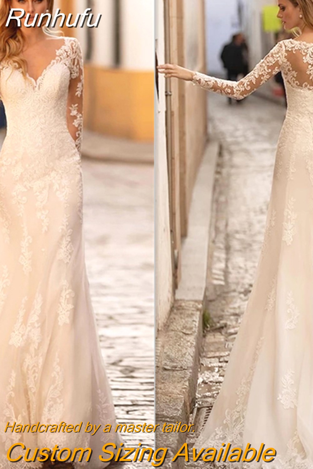 Runhufu Long Sleeve Lace Mermaid Wedding Dresses Gorgeous V-Neck Tulle Bridal Gown For Women With Button Back Sweep Train Customize