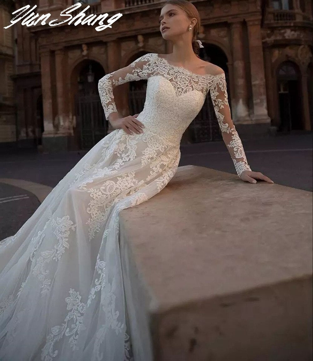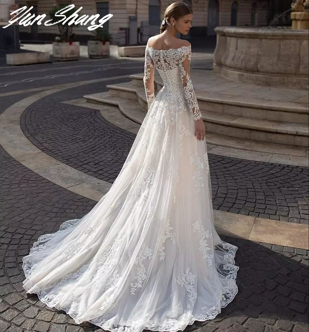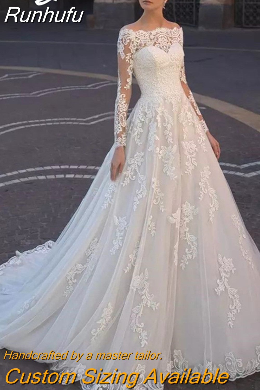 Runhufu Long Sleeve Wedding Dress A-Line 2023 Boat Neck Lace Appliques Sweep Train Chiffon Long Civil Bridal Gown With Button