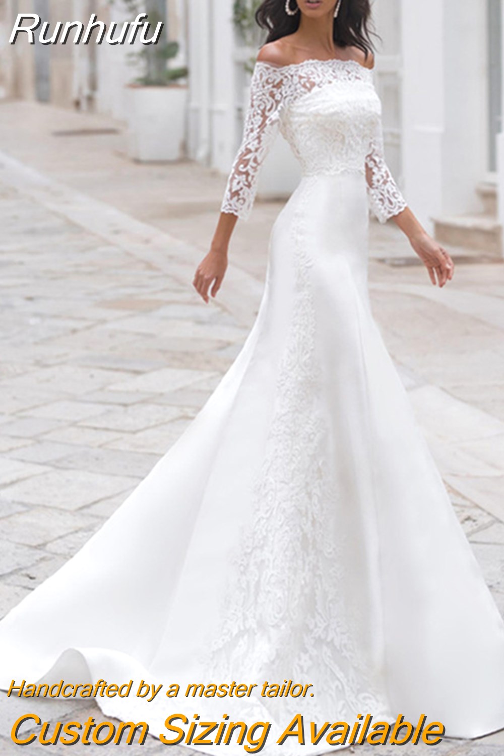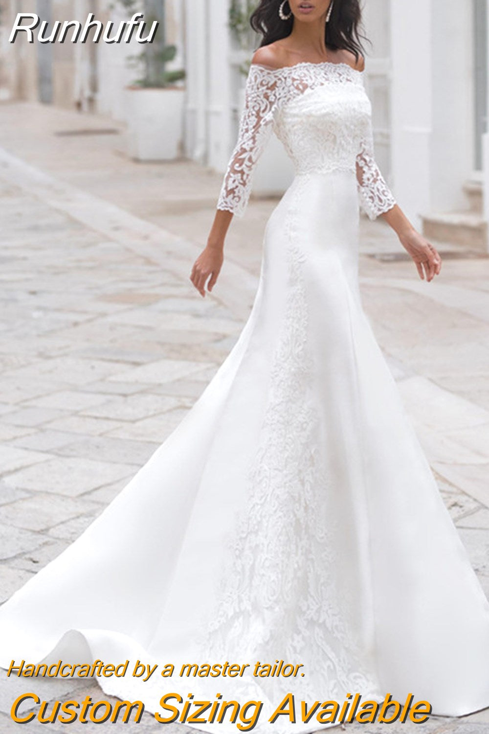 Runhufu Long Sleeves Lace Mermaid Wedding Dress For Bride Satin Bridal Gowns Elegant Plus Size Custom Made Vestido De Novia 2023