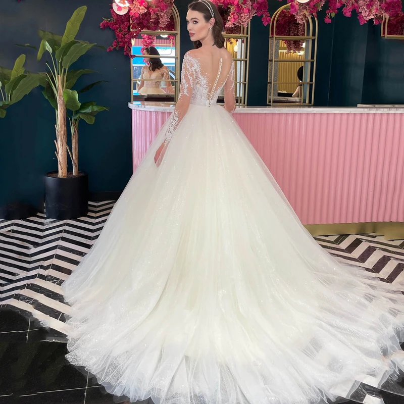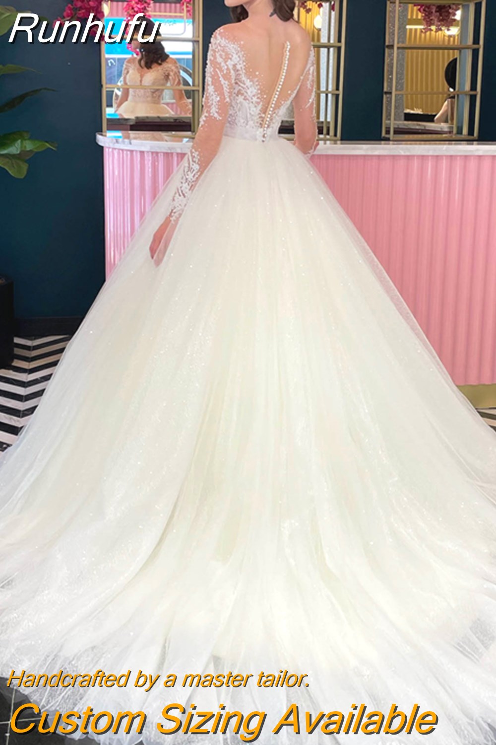 Runhufu Luxury Elegant Ladies Sexy V Neck Lace Applique 2023 Back Button Wedding Dress Sleeveless Bridal Beach Wedding Party