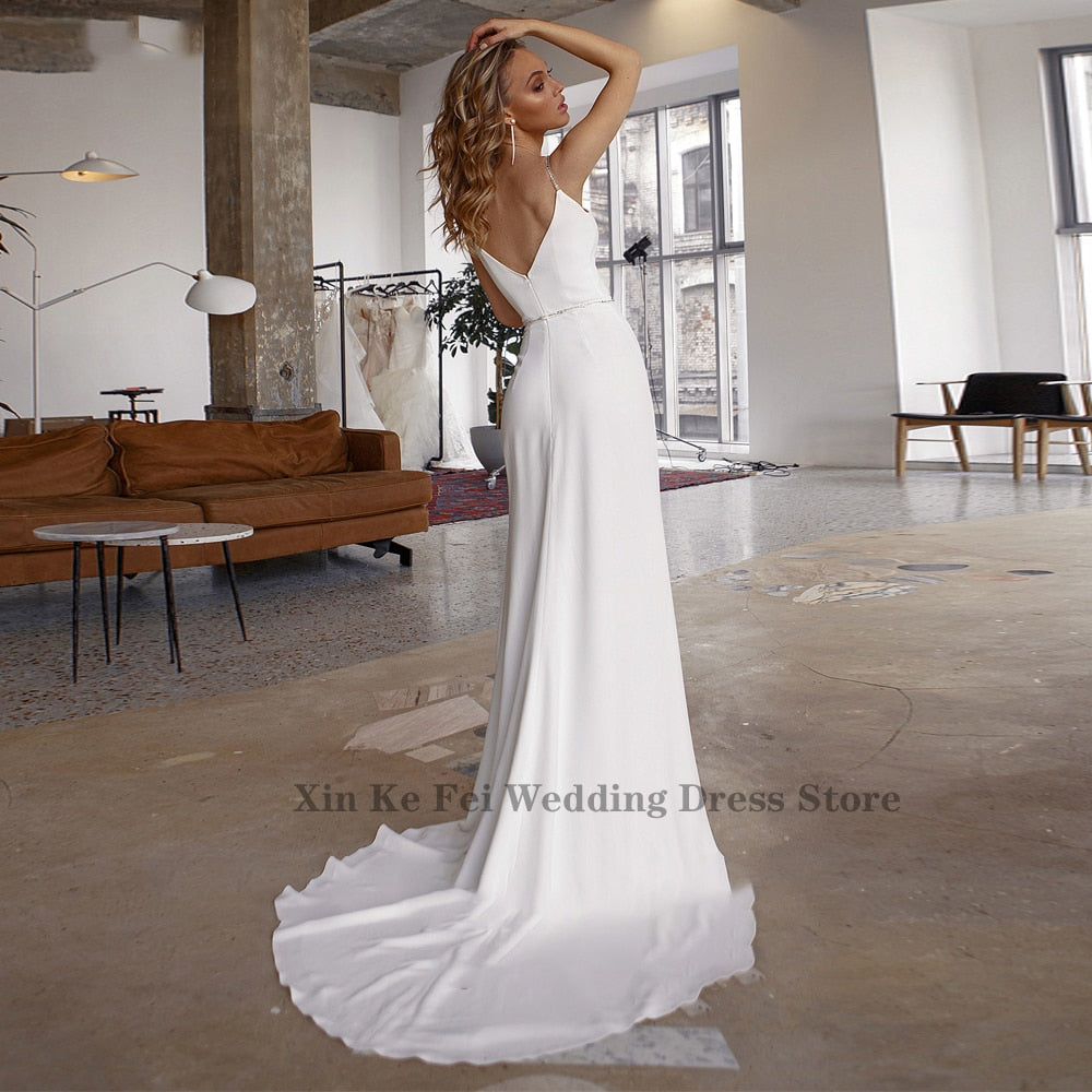 Runhufu Mermaid Wedding Dress Soft Satin Beach Bridal Dress Sexy V Neck Spaghetti Straps Luxury Beaded Princess Wedding Party Dres