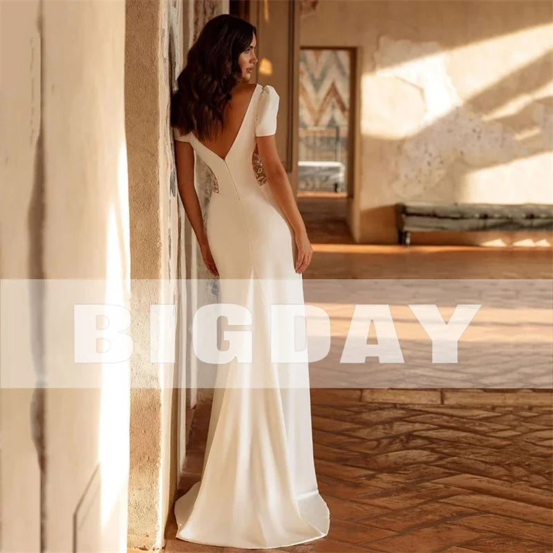 Runhufu Mermaid Wedding Dress Women Open Back V-Neck Short Sleeve Lace Appplique Satin Bridal Gown Sweep Train Vestidos De Noiva