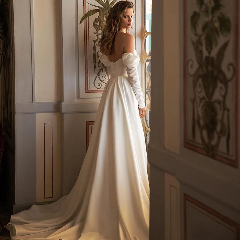 Runhufu Mermaid Wedding Dresses Off Shoulder Long Sleeves V-Neck Pleated Side Slit Bridal Gowns Backless Satin Bride Dress