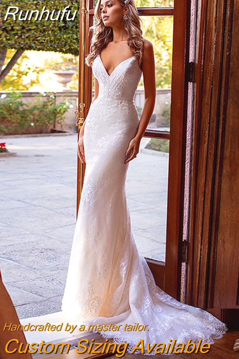 Runhufu Modern Lace Mermaid Sleeveless Bridal Wedding Dresses V Neckline with Straps Bridal Gowns for Bride Back Out Robe De