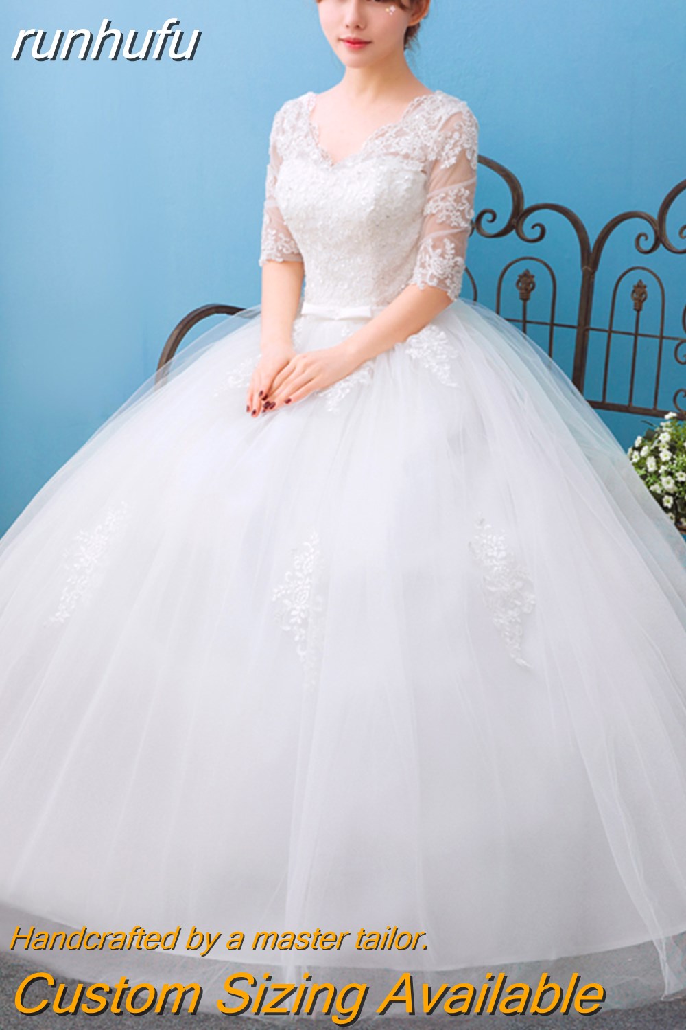 Runhufu NICEB 3/4 Lace Sleeves Wedding Dresses With Pocket Satin Sweep Train свадебное платье Bridal Ball Gowns Simple Customized