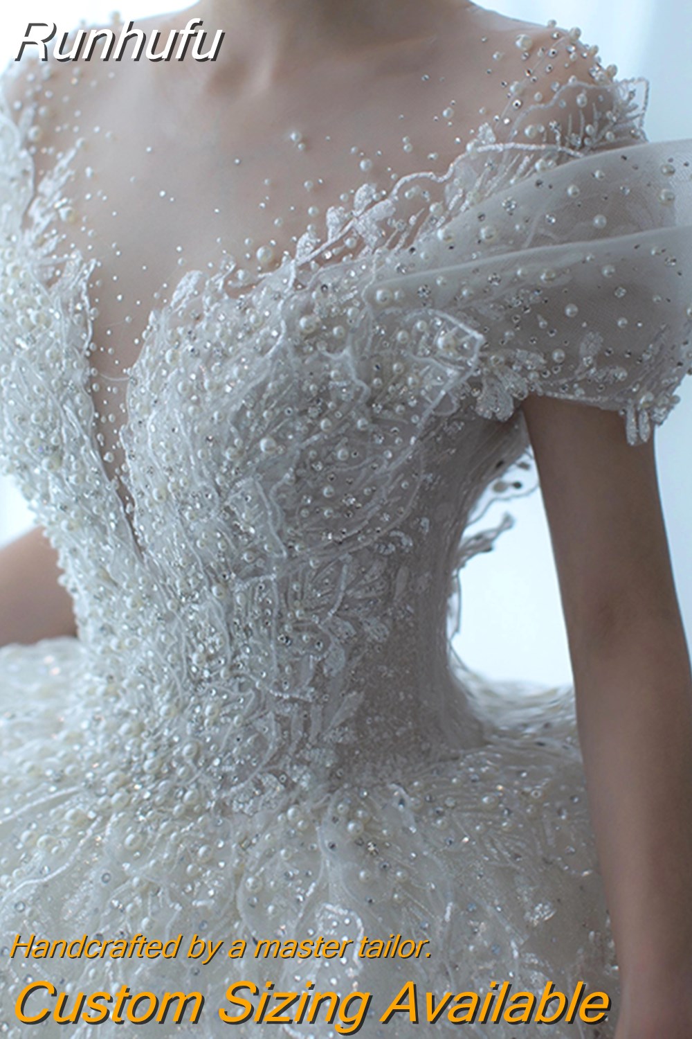 Runhufu New Luxury Wedding Dress Off The Shoulder V-neck Sexy Lace Applique Princess Wedding Gown With Pearls Vestido De Noiva