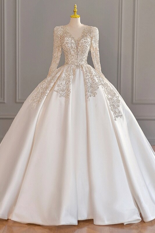 runhufu New Satin Wedding Dresses Full Sleeve V-neck Sweep Train Lace Up Ball Gown Wedding Dresses Sexy Backless Vestido De Noiva