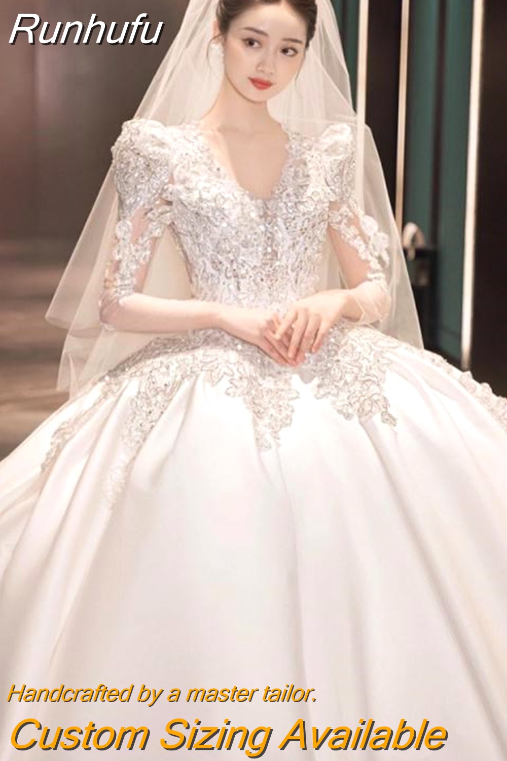 Runhufu New Satin Wedding Dresses Full Sleeve V-neck Sweep Train Lace Up Ball Gown Wedding Dresses Sexy Backless Vestido De Noiva