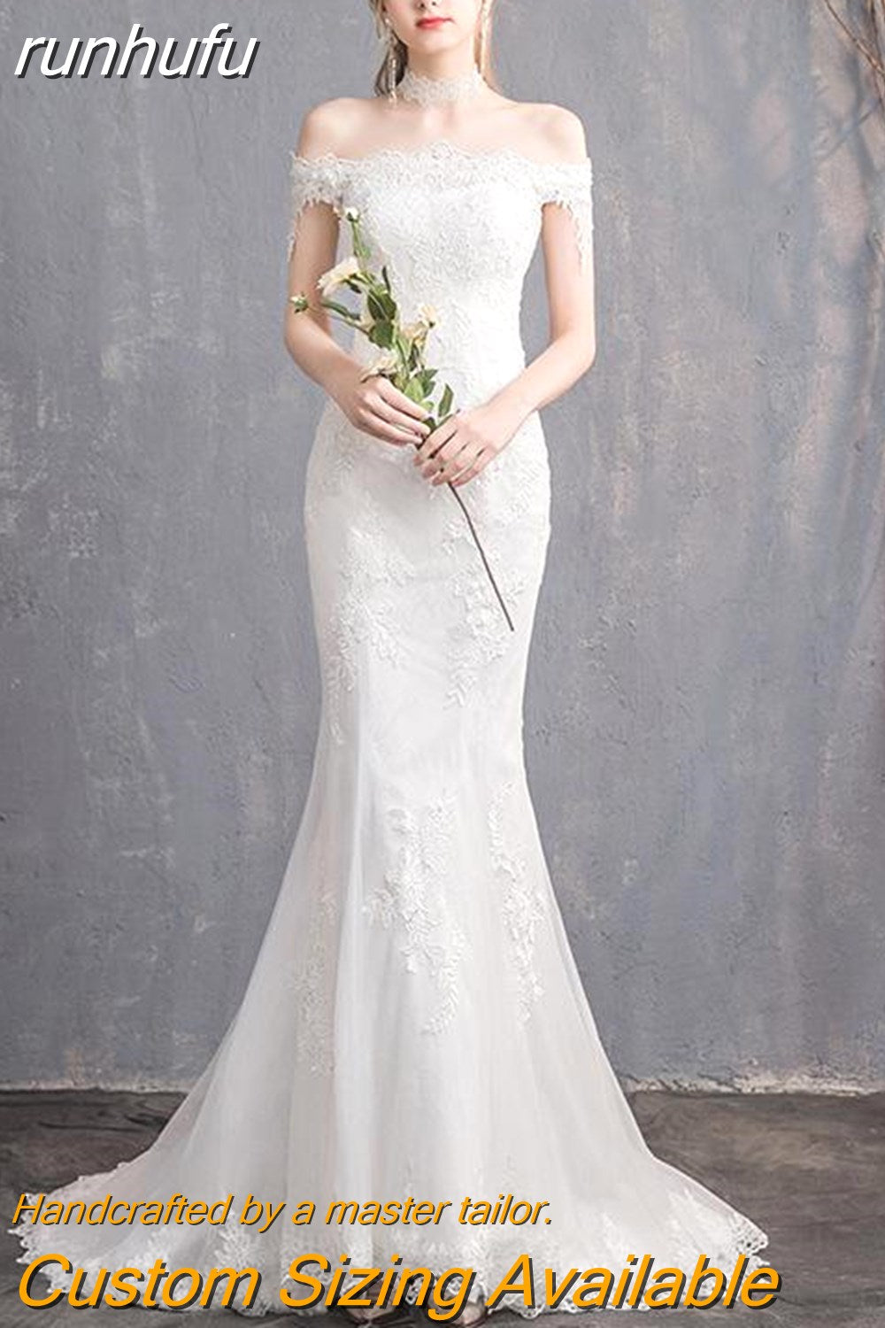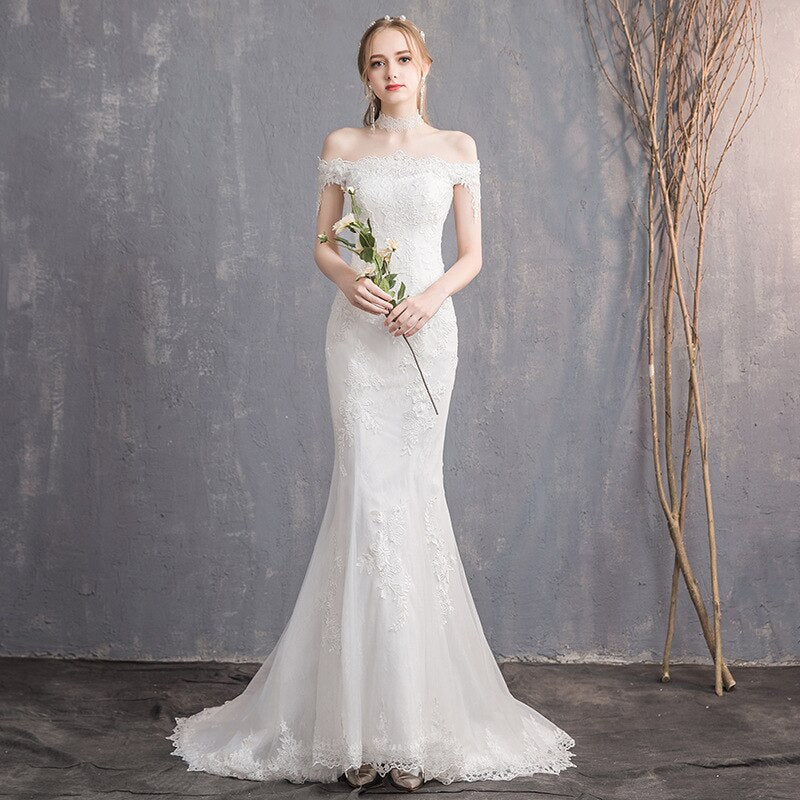 runhufu New Simple Mermaid Wedding Dress Off The Shoulder Floral Print Lace Up Bridal Dress Vestido De Noiva Plus Size Made Custom