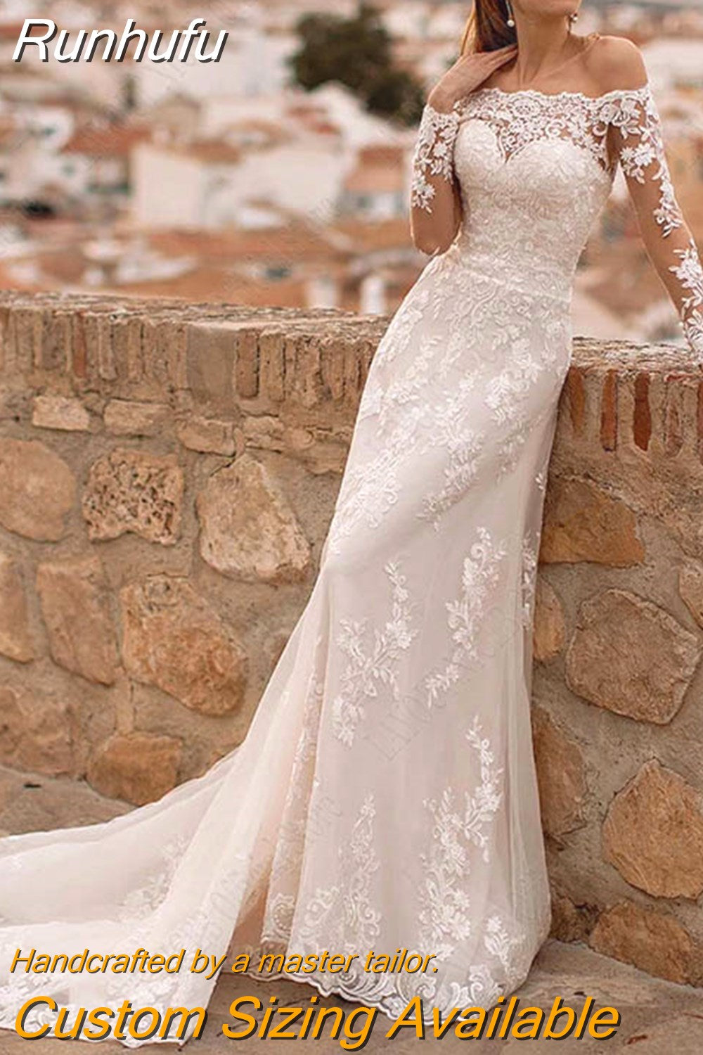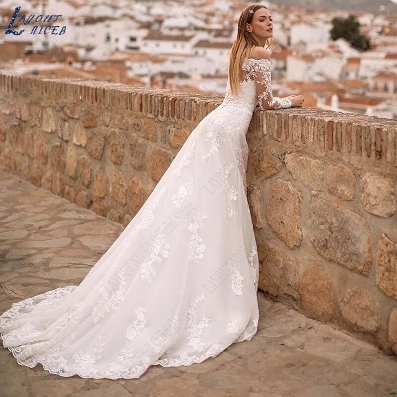 Runhufu NICEB Boat Neck Appliques Wedding Dress For Women Buttons Lace Vestidos De Noiva Mariage Boho Long Sleeves Bridal Gown