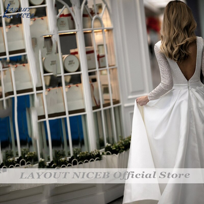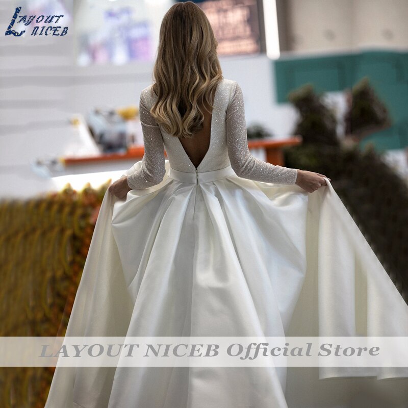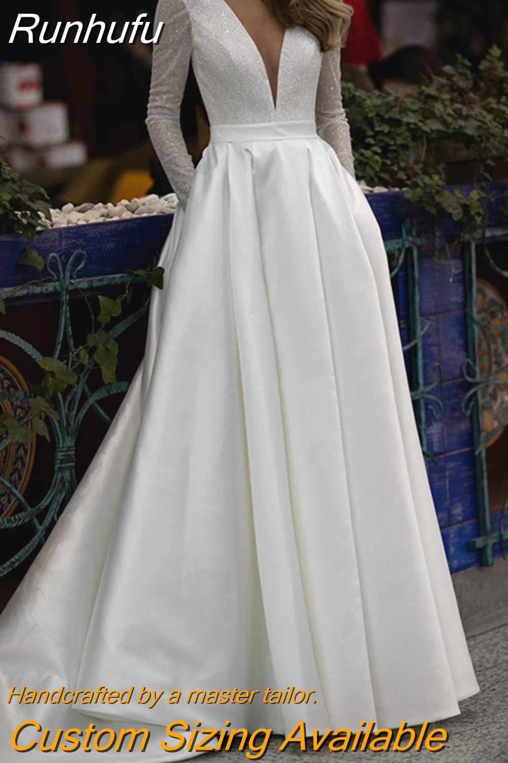 Runhufu NICEB Deep V Neck Shiny Wedding Dresses With Pockets Satin Sweep Train Wedding Gown Glitter Long Sleeve 2023 Bridal Party