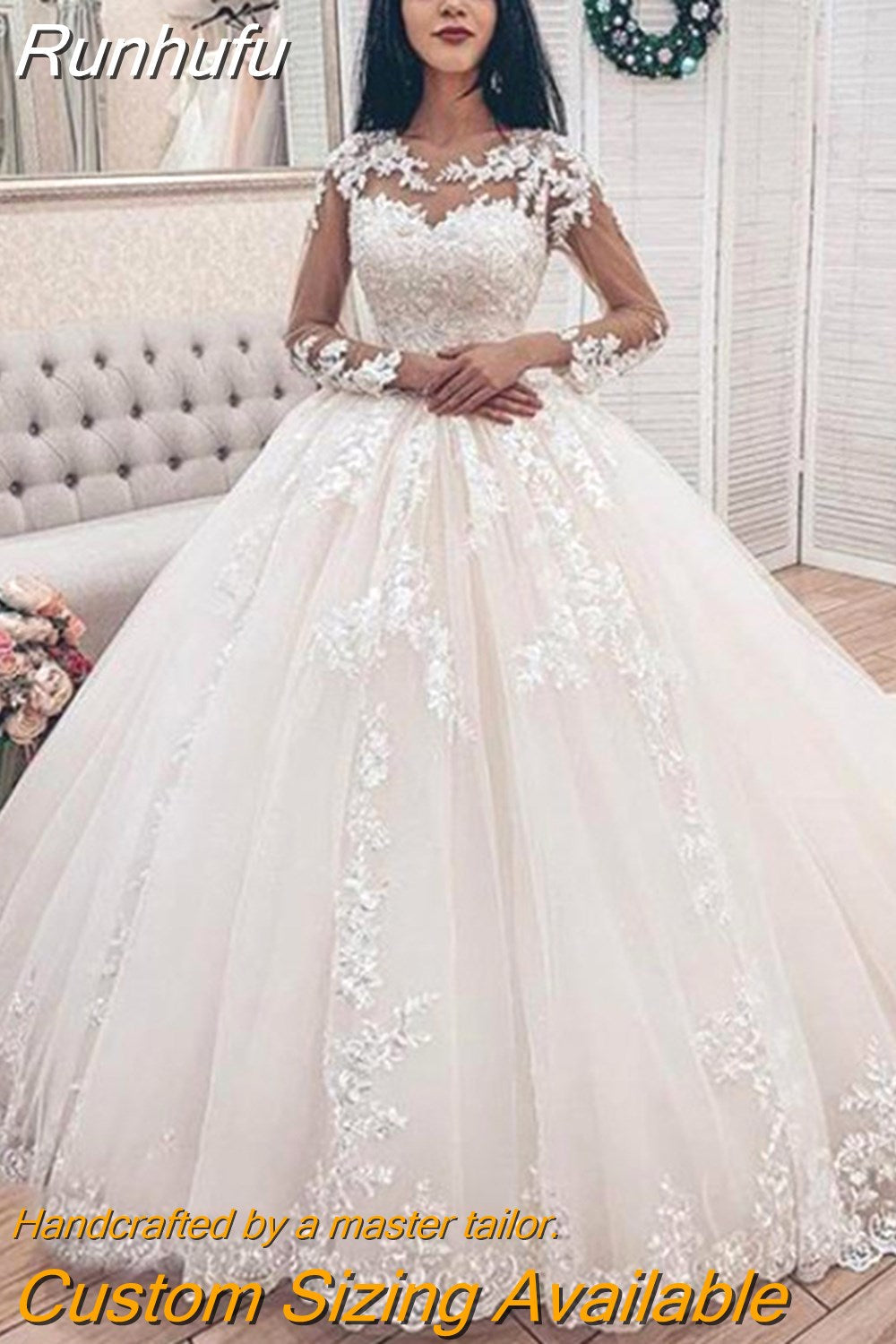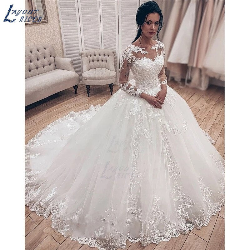 Runhufu NICEB Illusion Long Sleeves Ball Gown Wedding Dress 2023 Bridal Gown Lace Appliques vestido De Noiva Train robe de mariee