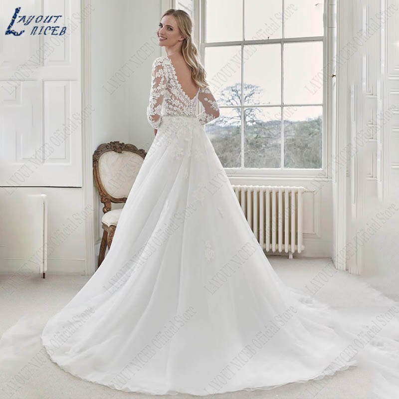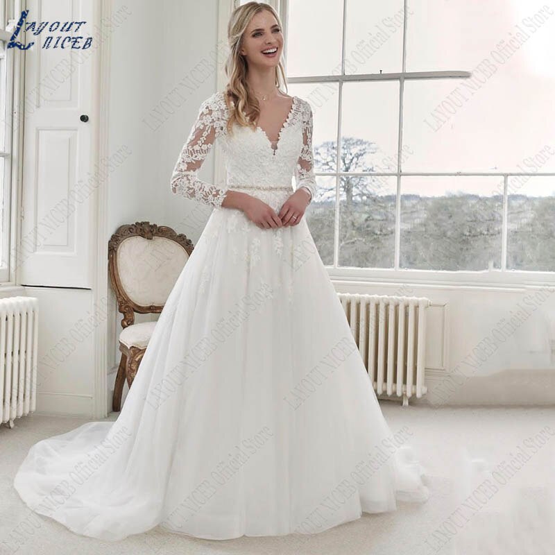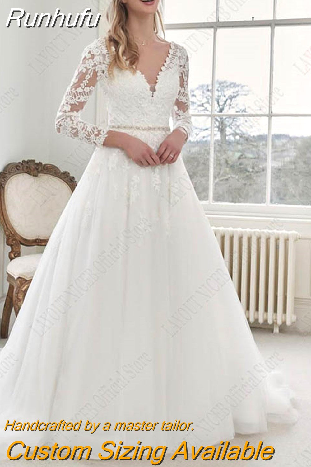 Runhufu NICEB Long Sleeve Appliques Wedding Dress For Women V Neck Lace robe de mariée bohème Bride Tulle Train Custom Made