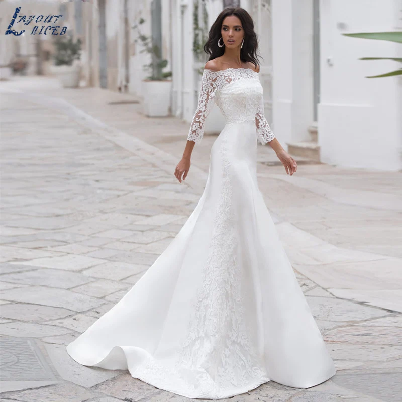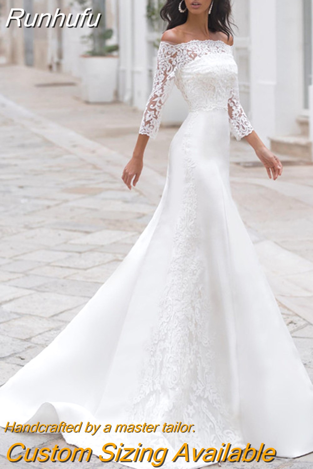 Runhufu NICEB Sexy Boat Neck Mermaid Wedding Dress 3/4 Lace Sleeves robe de mariée Off Shoulder Appliques Buttons Bridal Gown