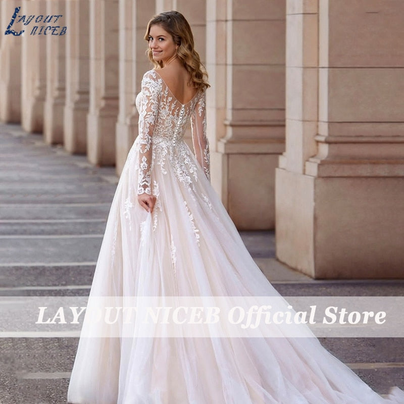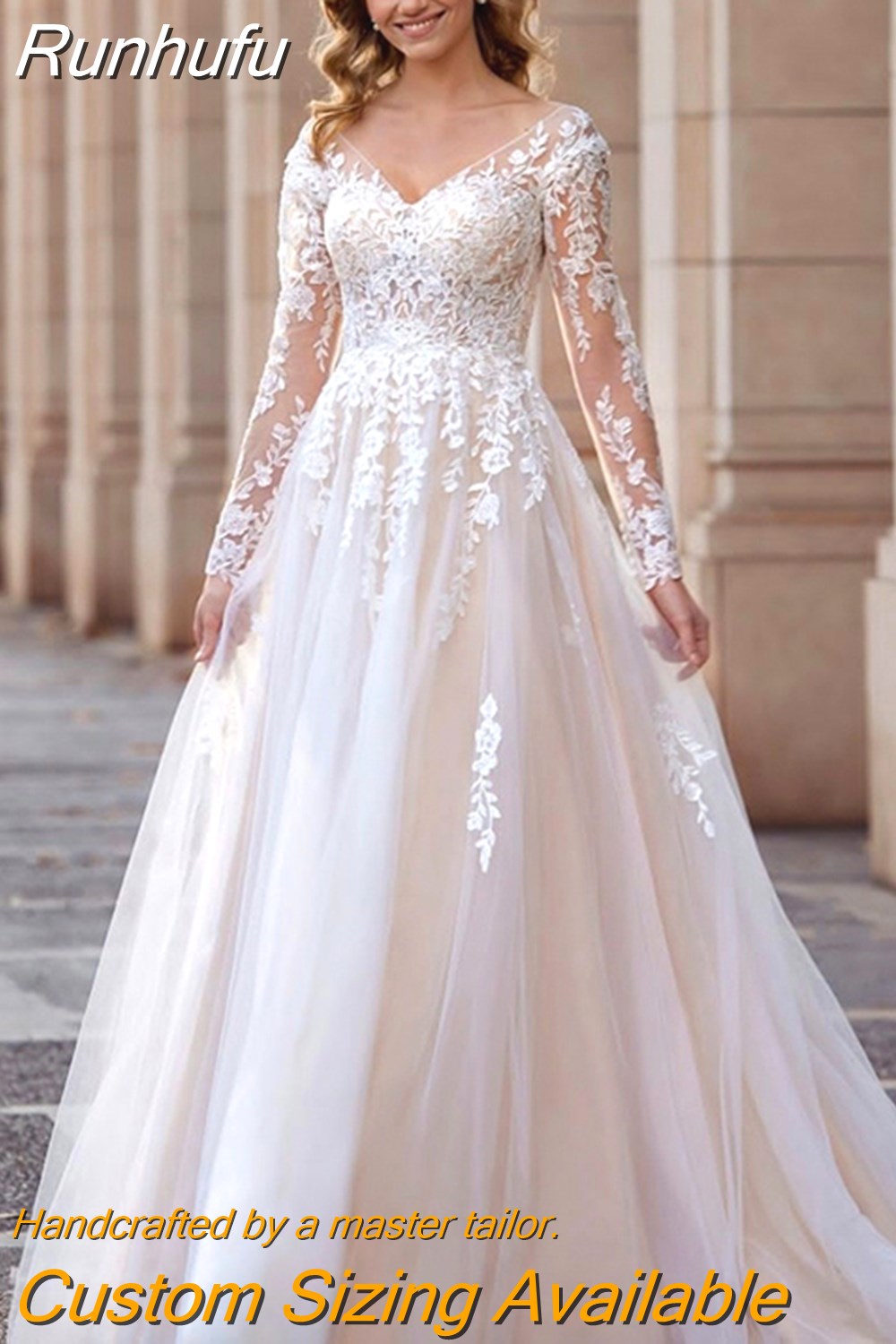 Runhufu NICEB Vintage Long Sleeve Wedding Dress Lace Appliques Robe De Mariée Illusion Back With Button Custom Made Sweep Train
