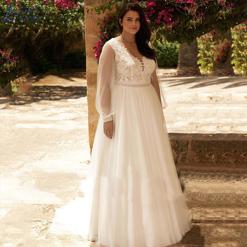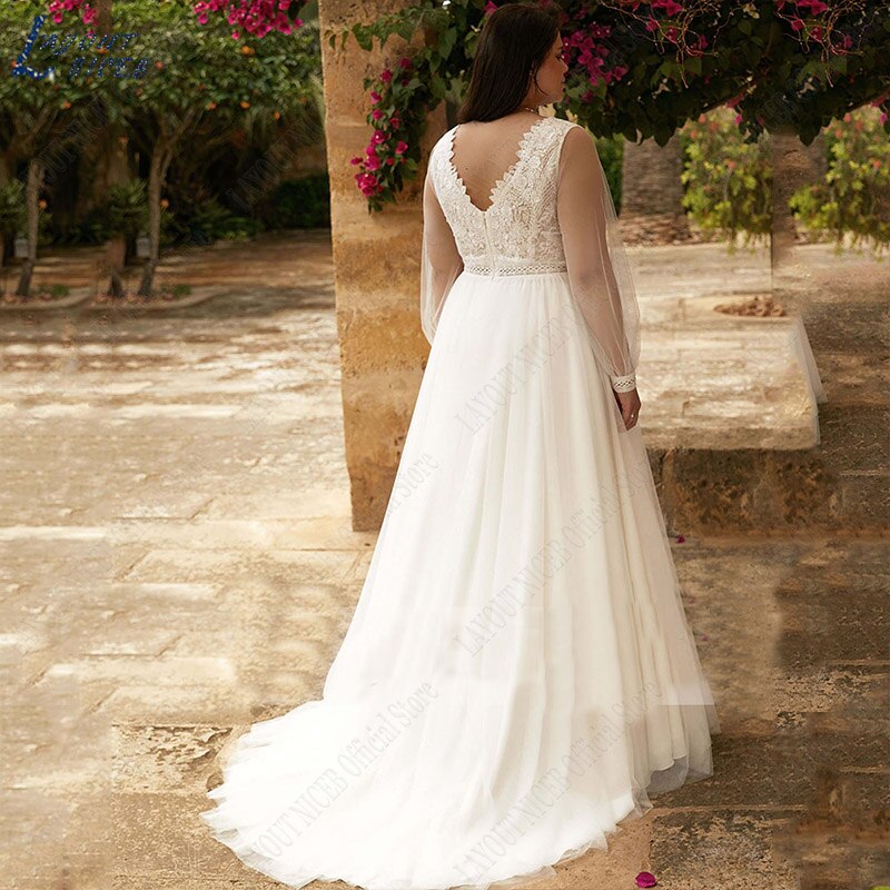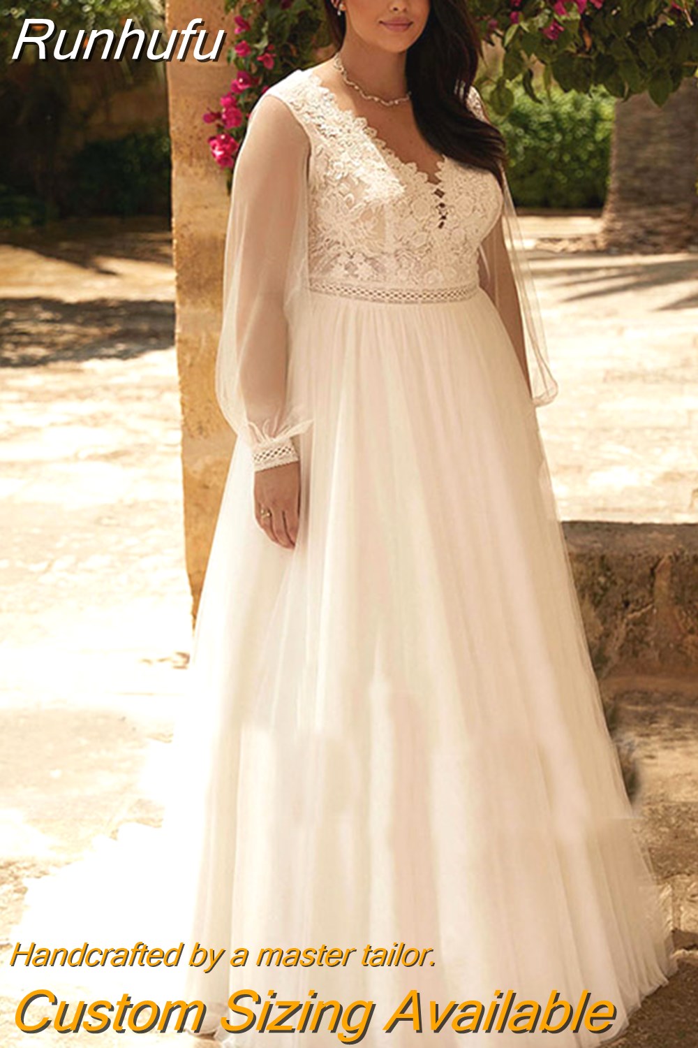 Runhufu NICEB Vintage Plus Size Wedding Dress Full Sleeves Lace Appliques Bride Gowns Tulle Open Back A-Line Vestido De Casamento