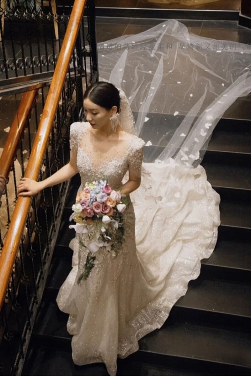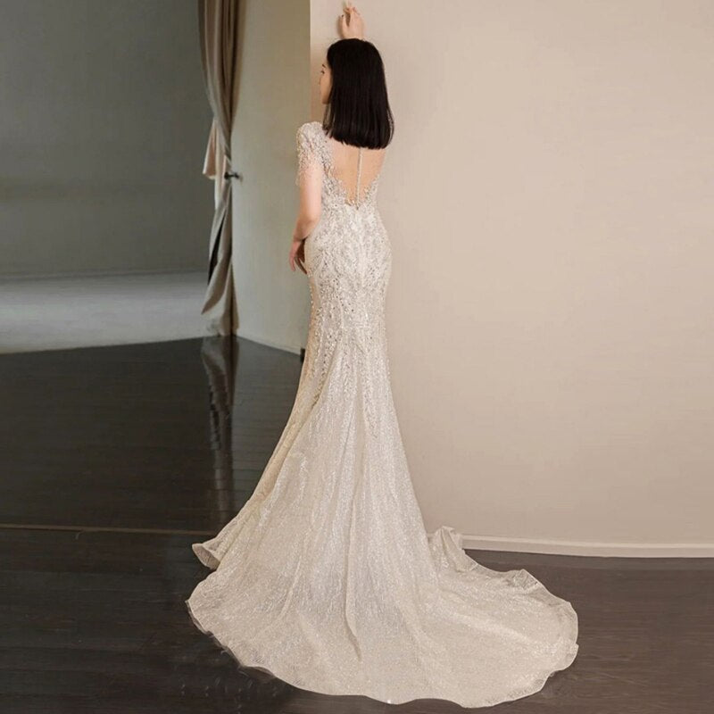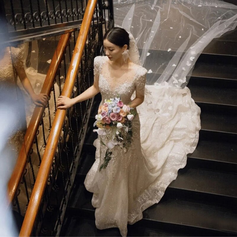 runhufu Novia 2023 Mermaid Wedding Dresses Short Sleeve Luxury Beading Lace Bridal Dress Court Train Shinny Vestido De Noiva