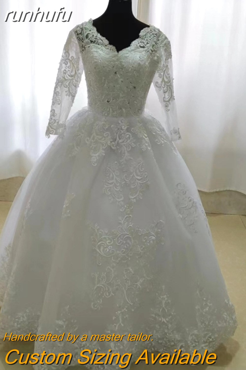Runhufu NICEB 3/4 Lace Sleeves Wedding Dresses With Pocket Satin Sweep Train свадебное платье Bridal Ball Gowns Simple Customized