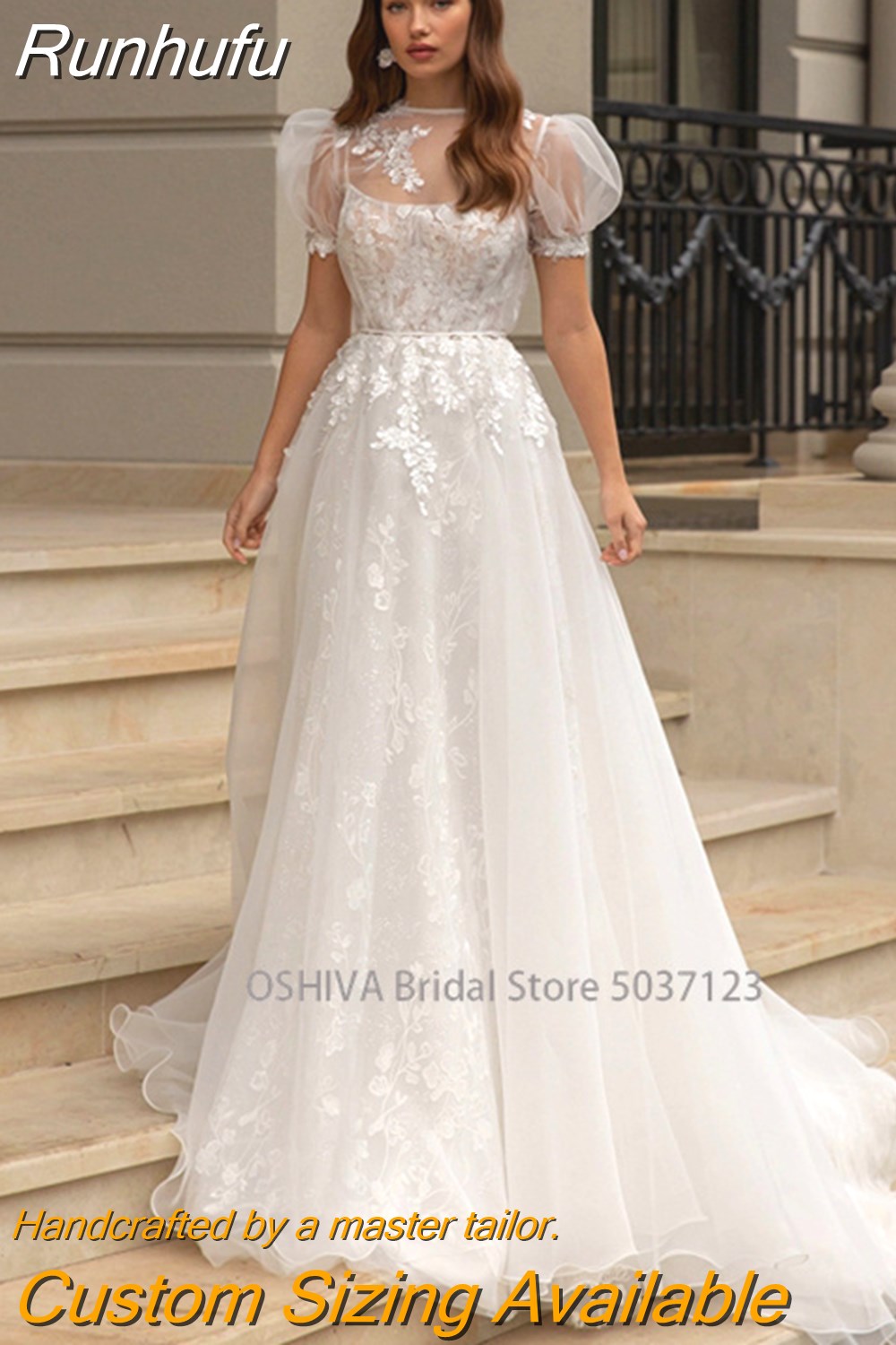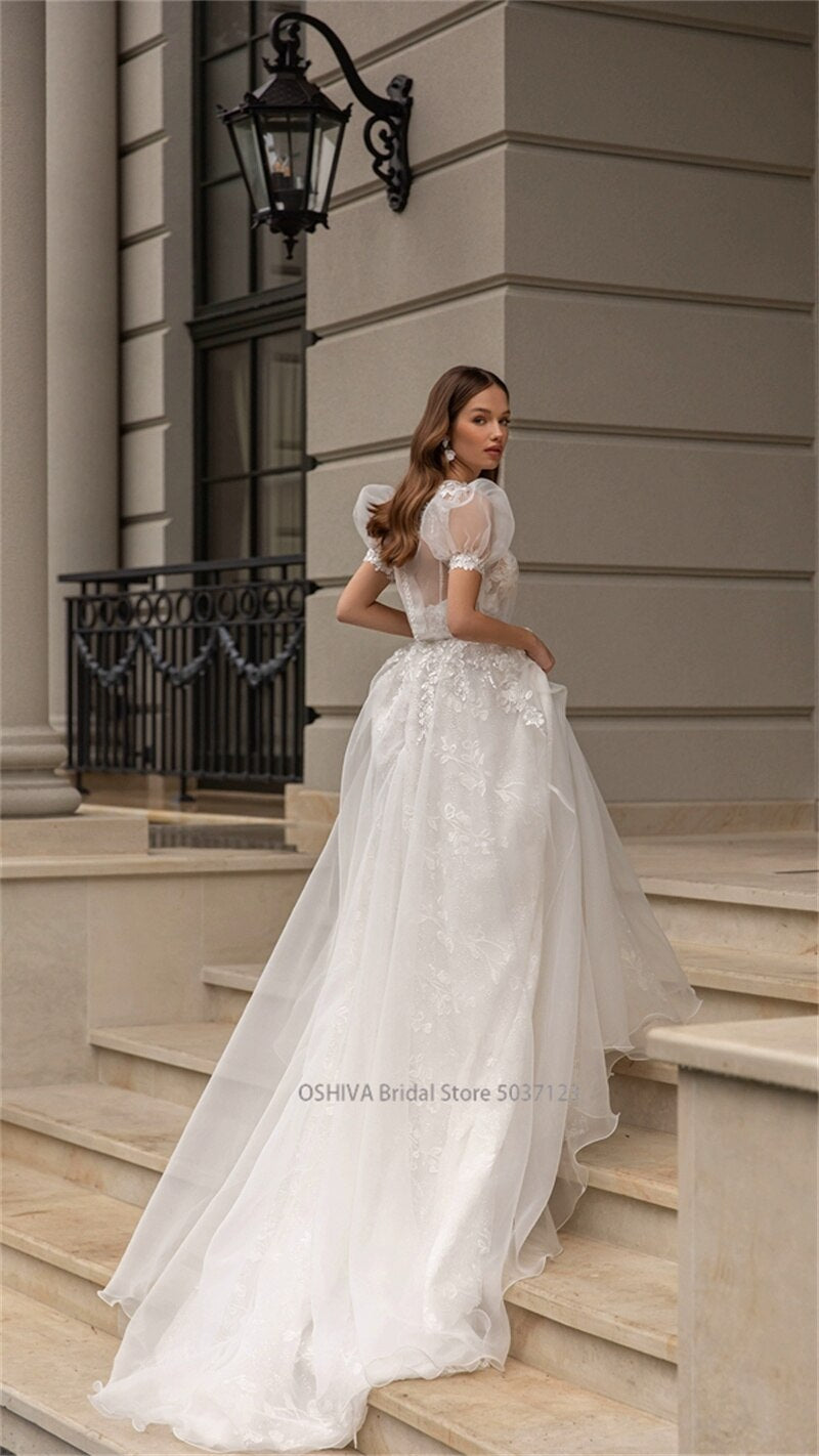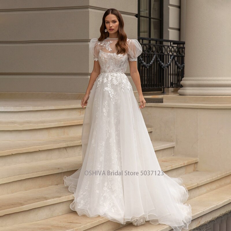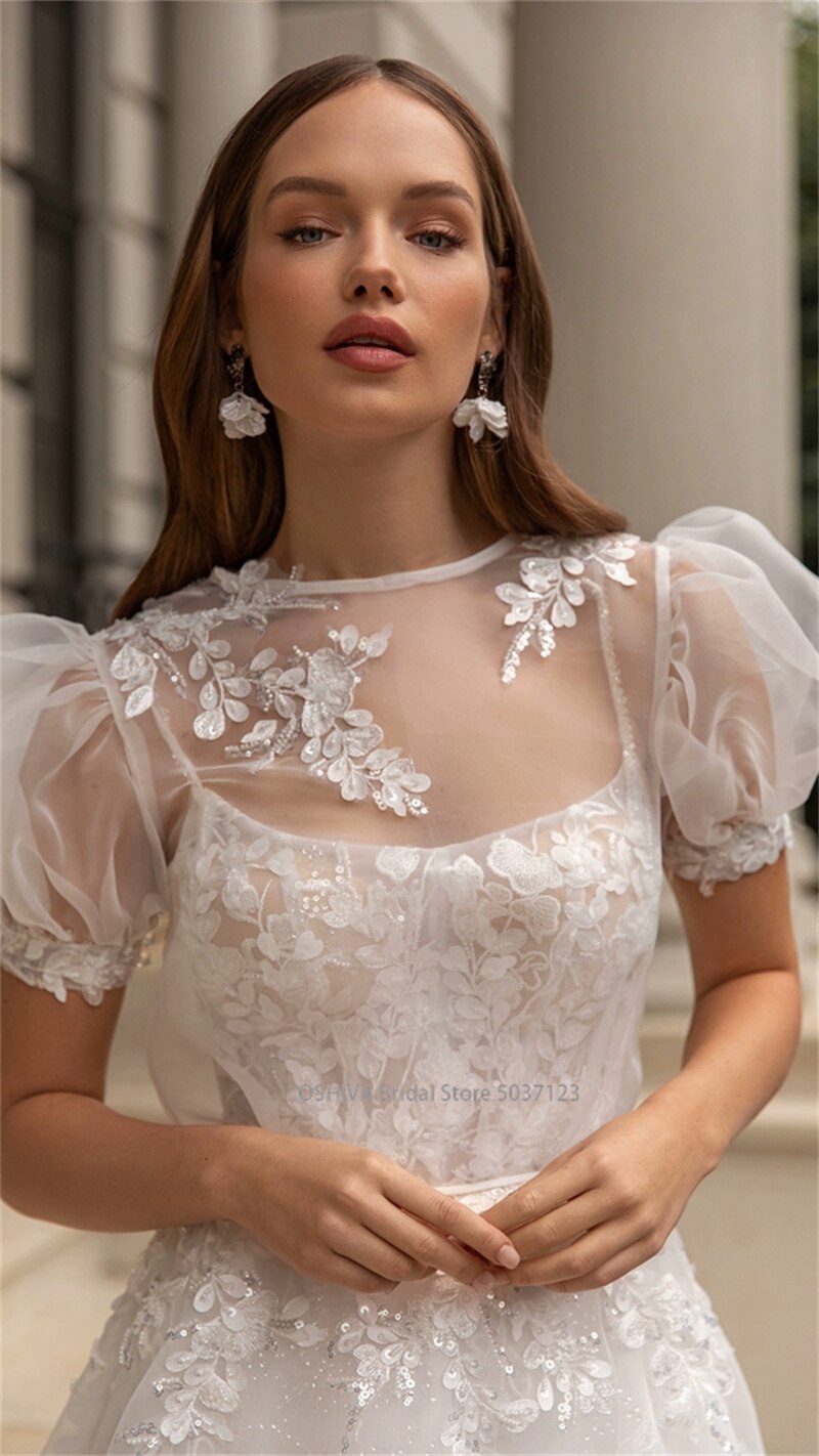 Runhufu O-Neck A-line Wedding Dresses Puff Sleeve Flower Open Back Floor Length Appliques Bridal Gown Vestidos De Novia
