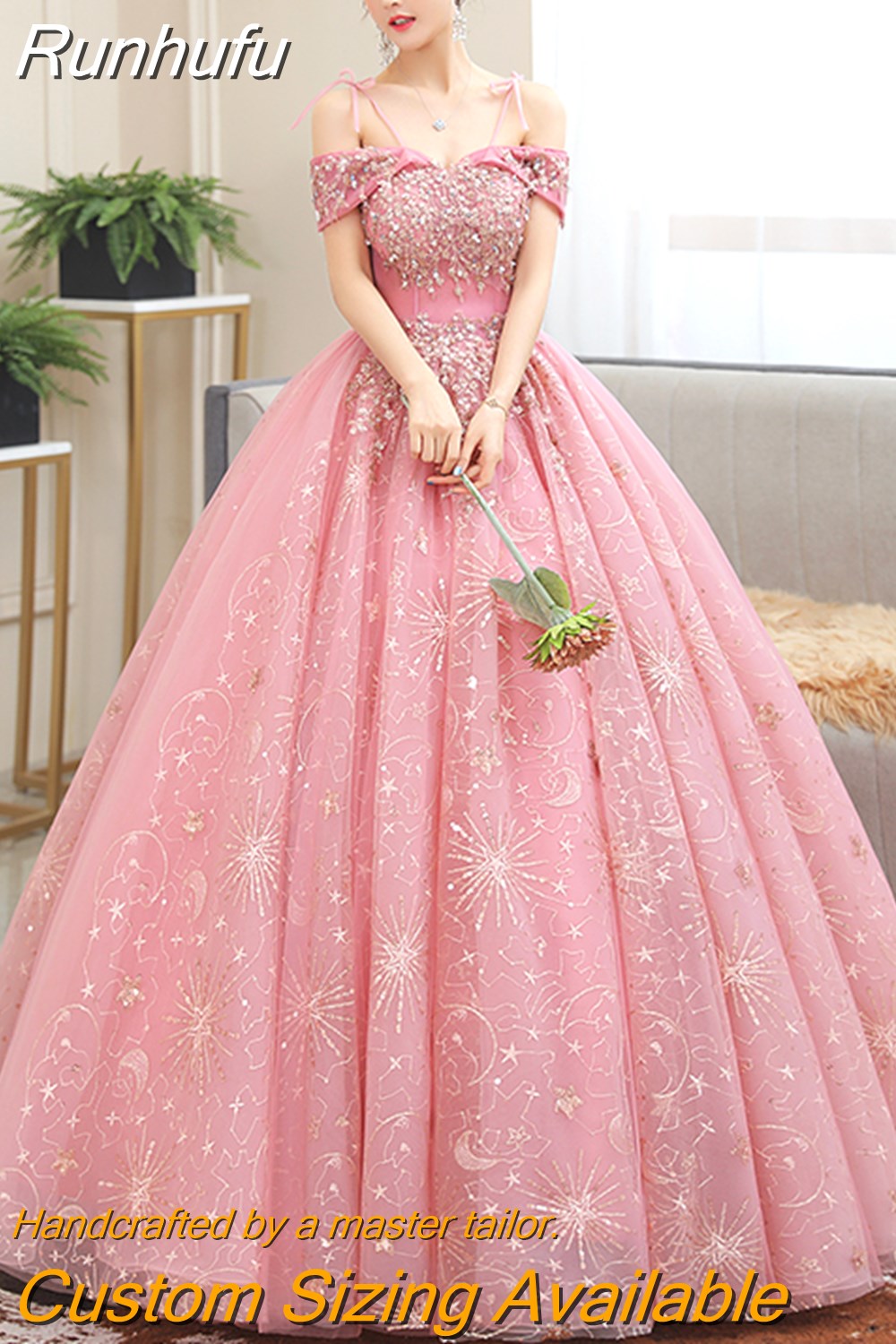 Runhufu Off The Shoulder Quinceanera Dresses Shining Beading Ball Gown Prom Dress Plus Size Pink Quinceanera Dresses