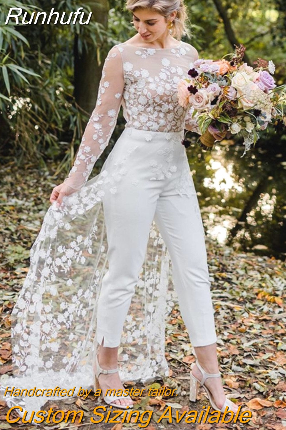 Runhufu Open Back Pant Suit Wedding Party Bride Gowns V-neck Applique Lace Long Sleeves Bridal Wedding Dresses Cheap New Dress