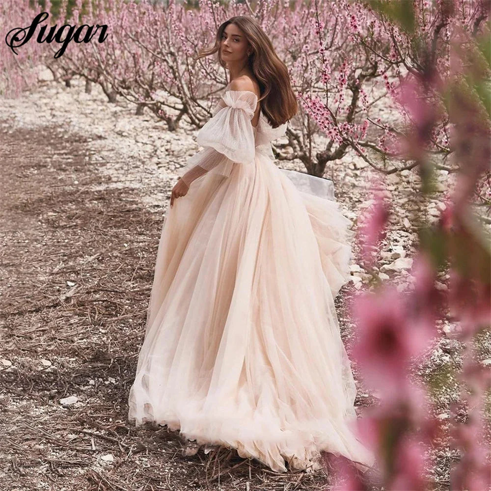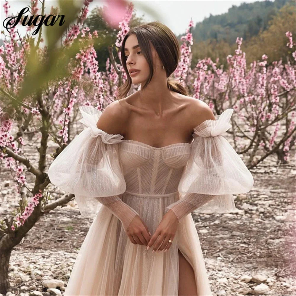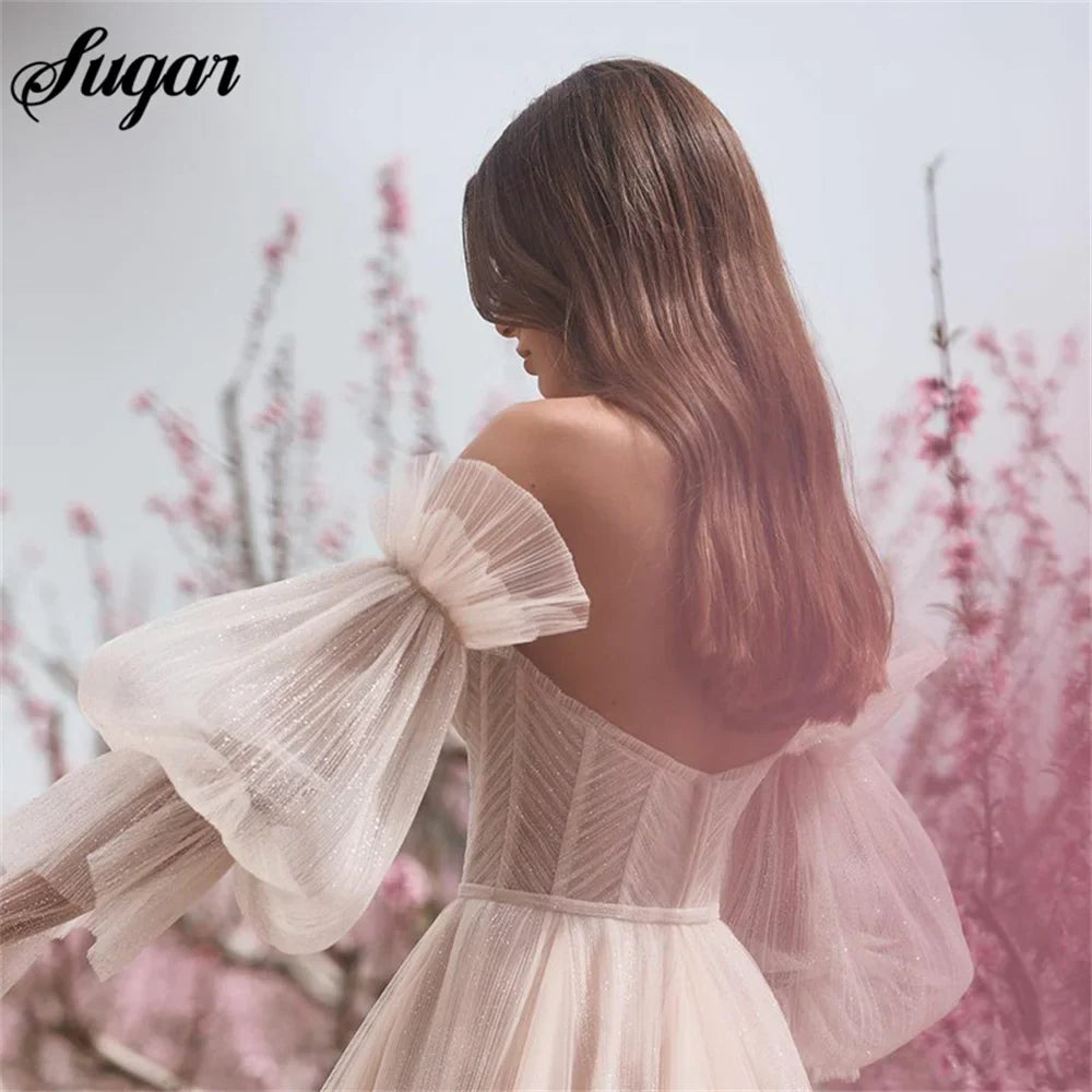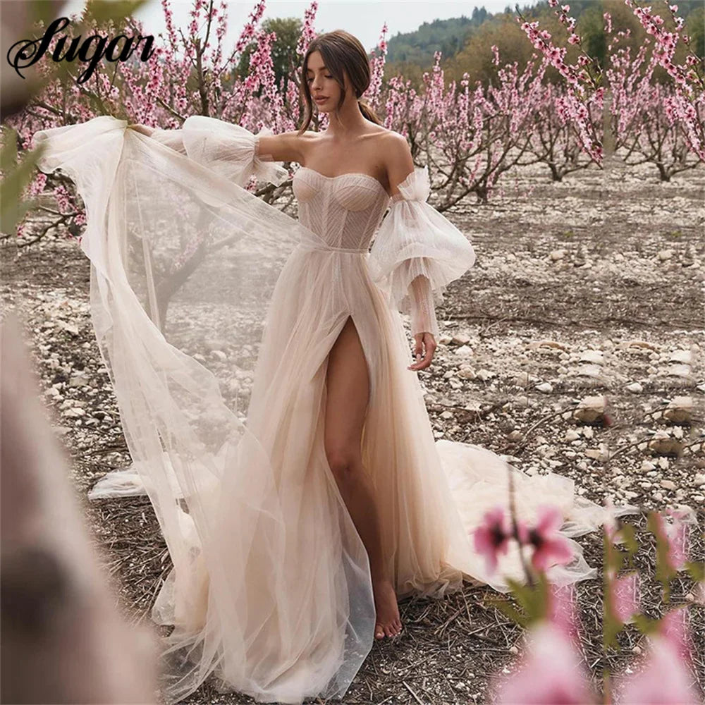 Runhufu Pink Boho Wedding Dress Detachable Puff Sleeve Bridal Dresses Sparky Pleat Side Split Wedding Gowns Beach Sweetheart vesti