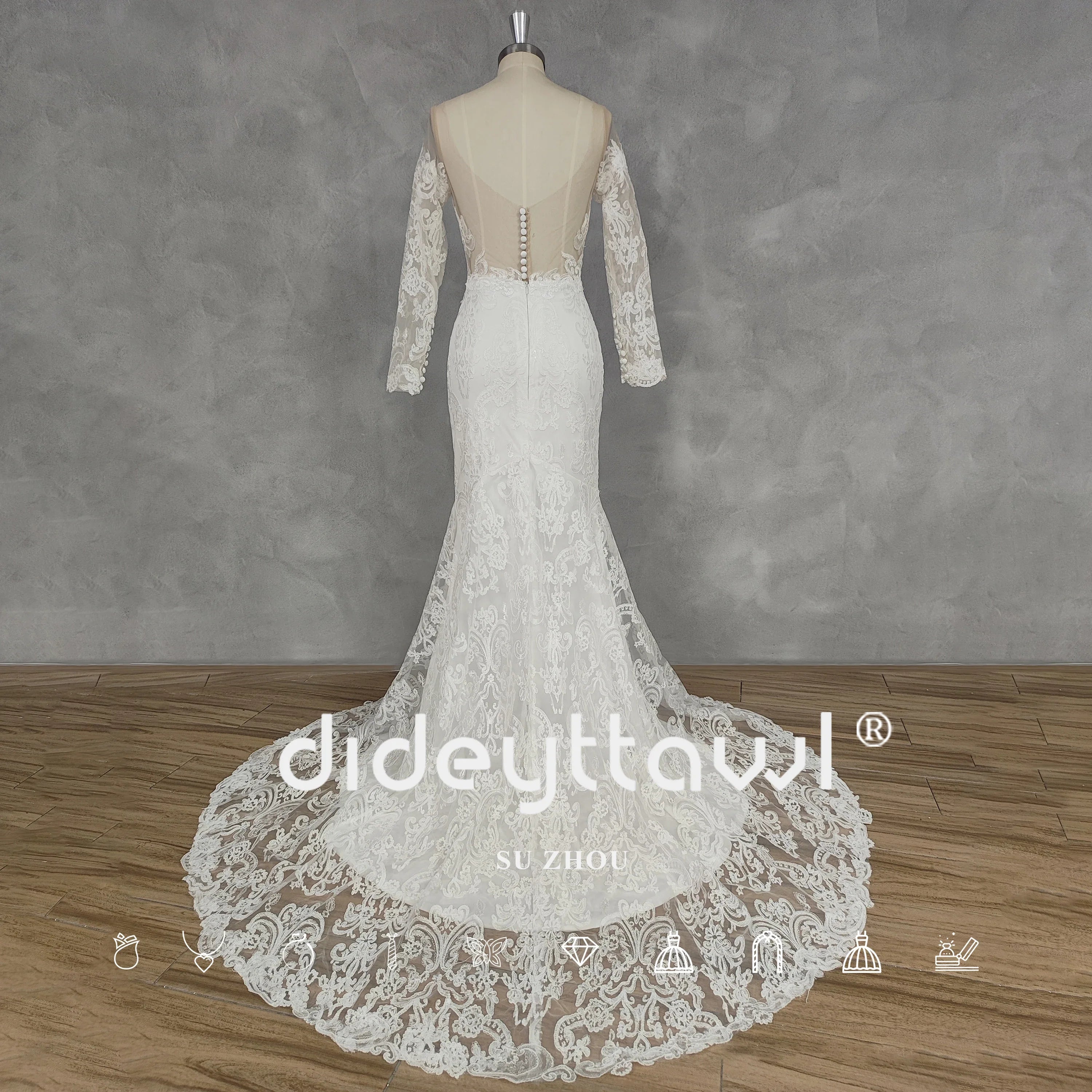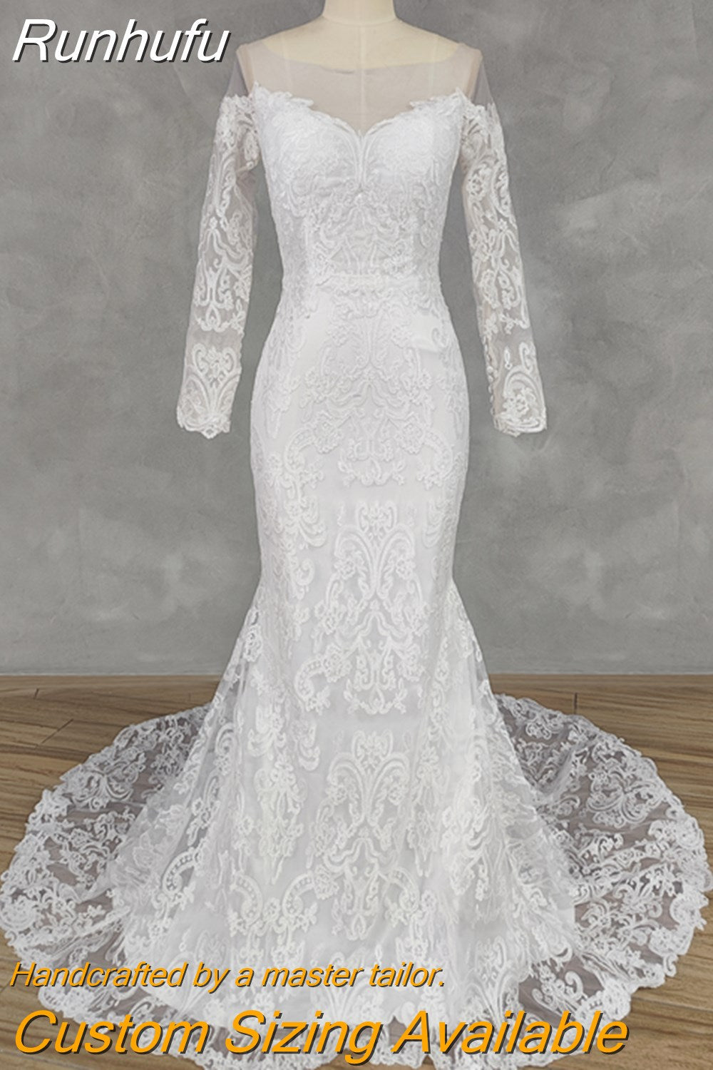 Runhufu Real Picture O-Neck Appliques Long Sleeves Crepe Mermaid Wedding Dress Illusion Back Court Train Bridal Gown