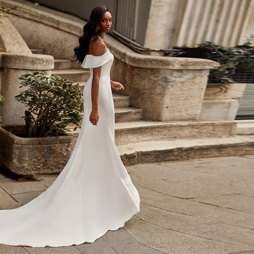Runhufu Satin Mermaid Wedding Dress 2023 Stylish Boat Neck Off The Shoulder Zipper Back Court Train Bridal Gowns Custom Made