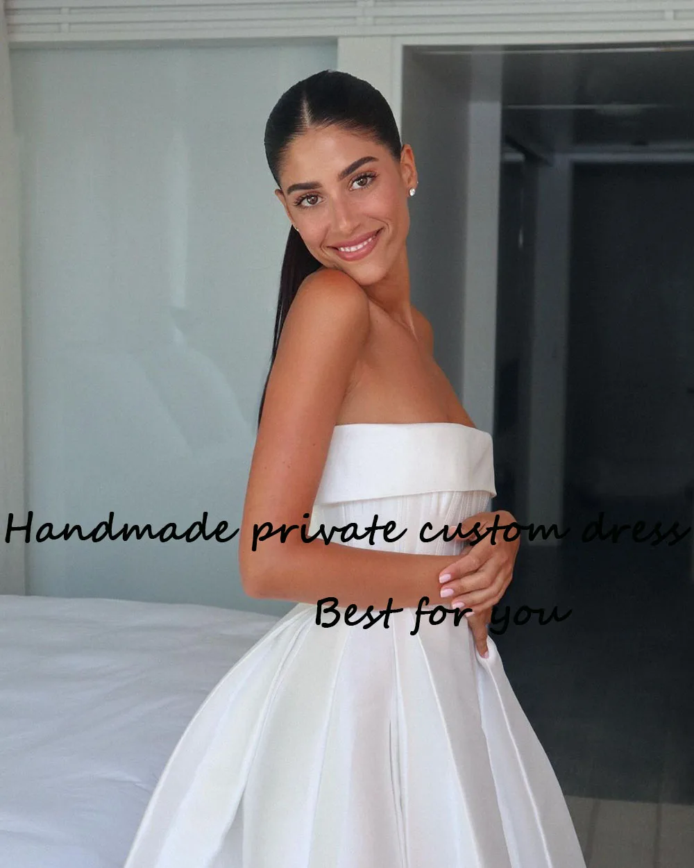 Runhufu Satin Strapless Wedding Party Dresses with Pockets A Line Short Ball Gowns Bride Dress Back Lace Up